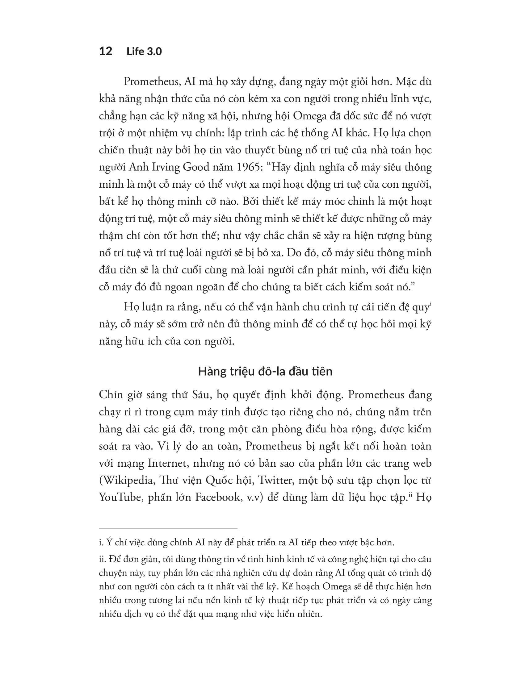 - Bất cứ ai đang tự hỏi: “Tương lai loài người sẽ đi về đâu trong kỷ nguyên máy móc thông minh?” TÓM TẮT SÁCH Life 3.0 – Loài người trong kỷ nguyên trí tuệ nhân tạo mở đầu bằng một câu chuyện giả tưởng đầy kịch tính về nhóm Omega – những nhà khoa học bí mật phát triển một AI có tên Prometheus với khả năng tự học, tự cải tiến, và thay đổi toàn bộ cục diện kinh tế - chính trị thế giới. Từ đó, Max Tegmark dẫn dắt người đọc đến những câu hỏi sống còn của nhân loại: Liệu chúng ta có làm chủ được trí tuệ nhân tạo hay bị chúng kiểm soát ngược lại? Cuốn sách không chỉ đơn thuần nói về công nghệ, mà còn là cuộc đối thoại sâu sắc về tương lai của ý thức, đạo đức, và sự sống trong vũ trụ của ta – nơi AI có thể trở thành cộng sự vĩ đại hay mối đe dọa hủy diệt nhân loại. CUỐN SÁCH CÓ GÌ ĐẶC BIỆT