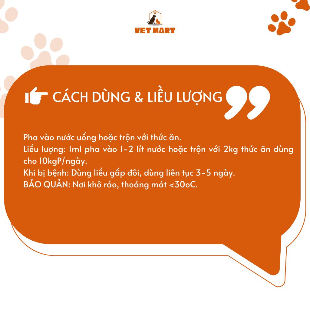 - Hiệu quả ngay từ giai đoạn con non, nuôi úm, tập cai sữa. ️CÁCH DÙNG VÀ LIỀU LƯỢNG: Xem chi tiết tại ảnh cách dùng trong album ảnh sản phẩm hoặc xem tại phiếu HDSD trong hộp (Do chính sách ngành hàng nên shop không thể ghi rõ thông tin tại đây) ️CHÍNH SÁCH ĐỔI TRẢ VET MART xin phép hỗ trợ khách hàng đổi trả sản phẩm trong trường hợp: Bước 1: Cung cấp clip & hình chụp tất cả sản phẩm khách nhận được, và nhắn tin cho shop Bước 2: Shop sẽ hỗ trợ gửi lại hàng cho khách nếu THIẾU sản phẩm. Và shop sẽ hỗ trợ đổi trả sản phẩm 1-1 nếu gửi SAI MẪU, sản phẩm lỗi do phía nhà sản xuất Tất cả chi phí phát sinh, shop sẽ chịu Lưu ý: