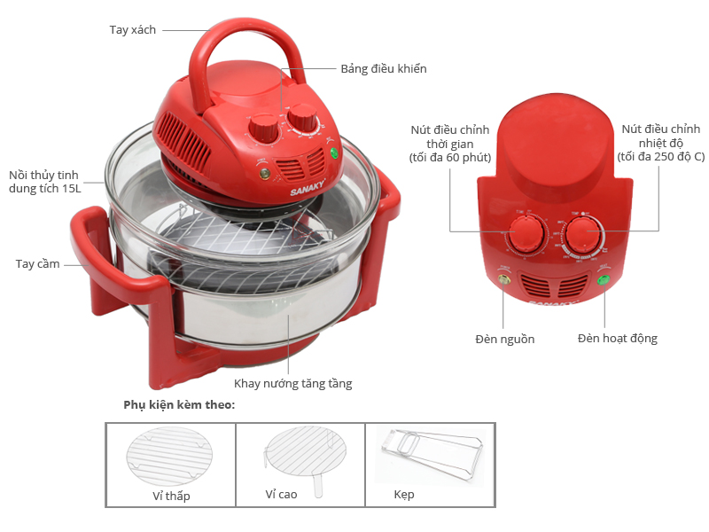Mua tại TiktokDung tích lớn Nồi có dung tích 15 lít cùng đai tăng thể tích, có thể tăng thêm 10cm làm tăng thể tích của nồi, giúp nướng được nhiều thực phẩm hơn, hay các loại thực phẩm nguyên con như: gà, vịt, Chất liệu cao cấp, an toàn Sanaky VH-188D có nồi nướng được làm bằng chất liệu thủy tinh cao cấp, chịu lực, cùng công nghệ đốt nóng bằng đèn Halogen, an toàn cho sức khỏe người sử dụng. Lò nướng đa năng