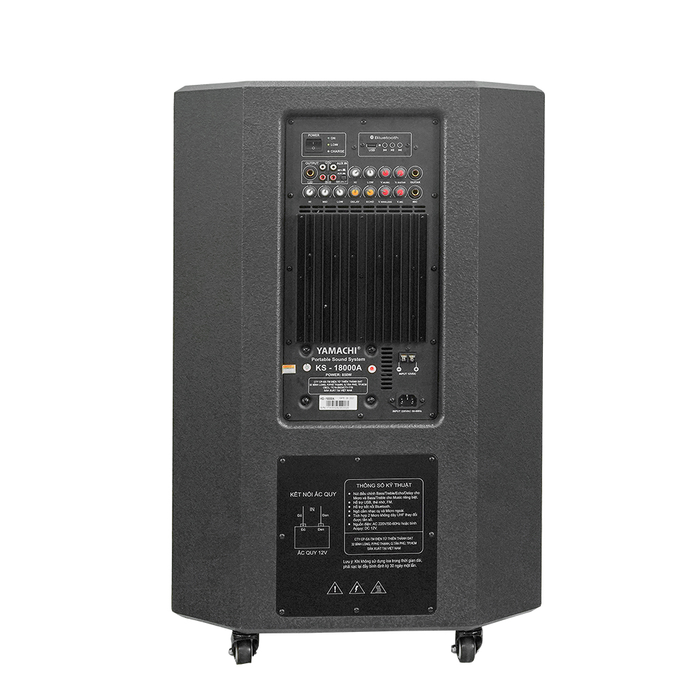 - Điều chỉnh nhạc gồm 3 nút: V. MUSIC, HI và LOW (volume, treble, bass) Sở hữu thiết kế nhỏ gọn và vô cùng hiện đại, nổi bật Yamachi KS-18000A chắc chắn sẽ không làm người dùng cảm thấy thất vọng. HỆ THỐNG CỦ LOA CHẤT LƯỢNG Loa Karaoke Yamachi KS-18000A trang bị hệ thống 3 ways bao gồm 1 loa bass 18 inches (5tấc) đem lại âm trầm mạnh, chắc, 01 loa mid 5 inches và 1 loa treble 1.5 inches kết hợp với họng còi lớn giúp cho âm cao trong trẻo và lan tỏa khắp không gian rộng lớn. Đáp ứng tốt các tần số thấp, giúp tăng cường hiệu ứng âm thanh và mang lại trải nghiệm karaoke chất lượng cao.Có khả năng chơi nhạc, hát karaoke tuyệt vời, âm thanh thực sự cuốn hút. Đặc biệt, người dùng có thể sử dụng loa hát mọi thể loại nhạc như: nhạc nhẹ, nhạc bolero, nhạc jazz, nhạc pop… đảm bảo mọi cuộc vui luôn sôi động, cuốn hút tất cả mọi người. KS-18000A là sự lựa chọn lý tưởng cho những người yêu thích karaoke. MỤC ĐÍCH SỬ DỤNG KS-18000A được thiết kế để đáp ứng các yêu cầu của một hệ thống karaoke chuyên nghiệp. Với tính năng kết nối đa dạng như Bluetooth, USB, cổng AUX bạn có thể dễ dàng kết nối với các thiết bị di động, máy tính bảng, TV và các nguồn âm thanh khác. Bạn cũng có thể điều chỉnh âm lượng, hiệu ứng âm thanh mang đến sự tiện lợi và linh hoạt trong việc điều chỉnh âm thanh. Với thiết kế tay kéo chắc chắn, hỗ trợ thêm tay nắm tiện lợi người dùng có thể mang loa KS-18000A đi khắp không gian. Cùng với khả năng hoạt động lên đến 5 giờ giúp loa hoạt động cực bền bỉ. Với thiết kế nhỏ gọn, trọng lượng nhẹ và cánh tay kéo tích hợp, bạn có thể dễ dàng mang nó đi mọi nơi. Cho dù bạn tổ chức tiệc karaoke tại nhà, đi picnic hoặc tham gia các sự kiện ngoài trời, hệ thống karaoke này sẽ trở thành người bạn đồng hành đáng tin cậy. KS-18000A hỗ trợ cổng kết nối DC 12V bên ngoài giúp bạn linh động hơn trong trường hợp hết bình acquy. PHỐI GHÉP DỄ DÀNG KS-18000A được trang bị khả năng kết nối không dây, có dây hiện đại. Truyền phát không dây bluetooth mới nhất mang đến cho người dùng trải nghiệm âm nhạc tuyệt vời. Bạn có thể dễ dàng kết nối với các thiết bị khác nhau như điện thoại di động, máy tính bảng, máy nghe nhạc để phát nhạc karaoke yêu thích của bạn. Bạn cũng có thể điều chỉnh âm lượng, hiệu ứng âm thanh. Ngoài ra, hệ thống các cổng Bluetooth, USB, AUX cũng mang đến những tiện ích, khả năng nghe nhạc đa nguồn.