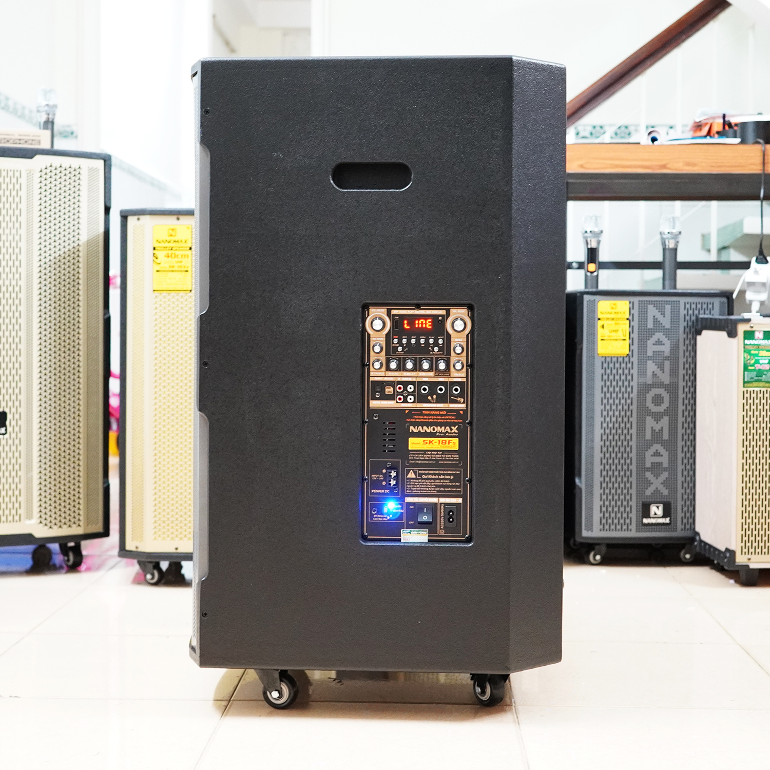 Cuối cùng, loa kẹo kéo Nanomax SK-18F5 có ngoại hình hầm hố 51x53x89cm thực sự rất lớn ngang con loa 6 tấc, loa Bass đập khỏe mạnh, khi cần có thể chỉnh thành chất âm ấm; loa Treble vang xa, kết hợp loa Mid tạo ra âm thanh có chất lượng vượt trội, đi rất xa, nên chỉ những không gian rộng thoáng mới đủ để em nó thể hiện bản lĩnh của mình.