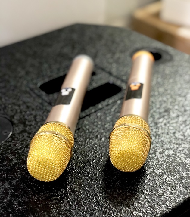 _Nguồn DC 12V bat in _ Bass 2T x 2, Treble x 10 _ Sử dụng bo CLASS D _Hỗ trợ USB, HDMI, Bluetooth, guitar in, mic in _Phụ kiện 2 mic cầm tay không