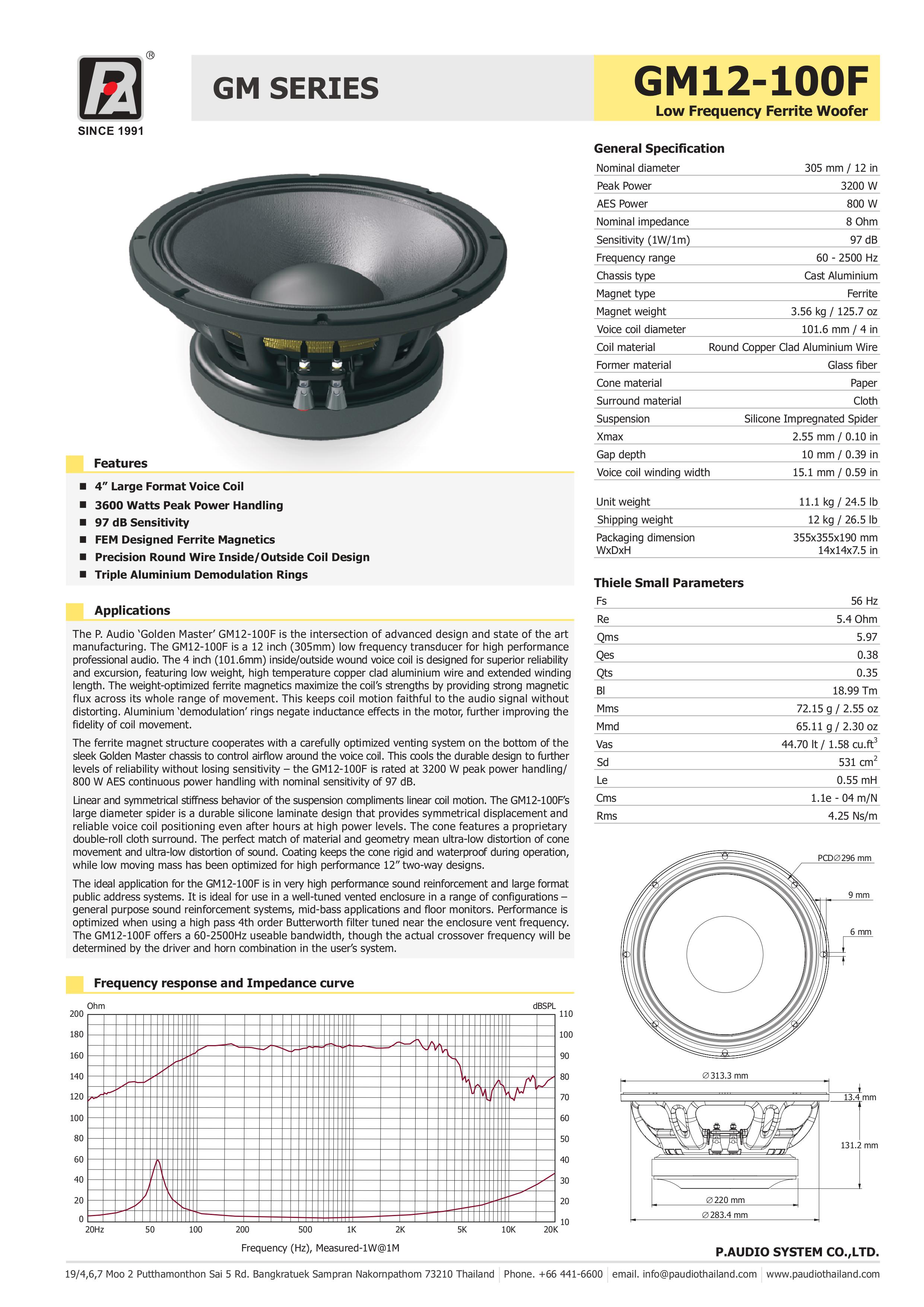 Xuất xứ: Ý Độ nhạy trung bình 96 dB SPL 1W / 1m. 65 mm (2.5 in) aluminum edgewound voice coil. Công suất 300W Công suất liên tục 600W. Độ dịch chuyển cao cho độ