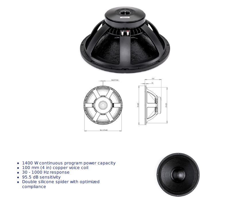 Mua tại TiktokLOA RỜI SUB 5 TẤC B&C Xuất xứ : ITALIA Voice coil bằng đồng khổ lớn 4" (100mm) cao 21mm Công Suất Program 1400 W Dải tần: 30-1000 hz Độ nhạy: 95,5 db Nam châm Ferrite Mạng nhện đôi bằng silicone Voice coil loa B&C SPEAKERS 18PS100 được thiết kế có độthông thoáng nhất định giúp bảo vệ loa. Kích thước loa: 460 x 197 mm Đường kính đến vị trí bắt ốc: 440mm Khối lượng loa: 10,5 kg BẢN VẼ