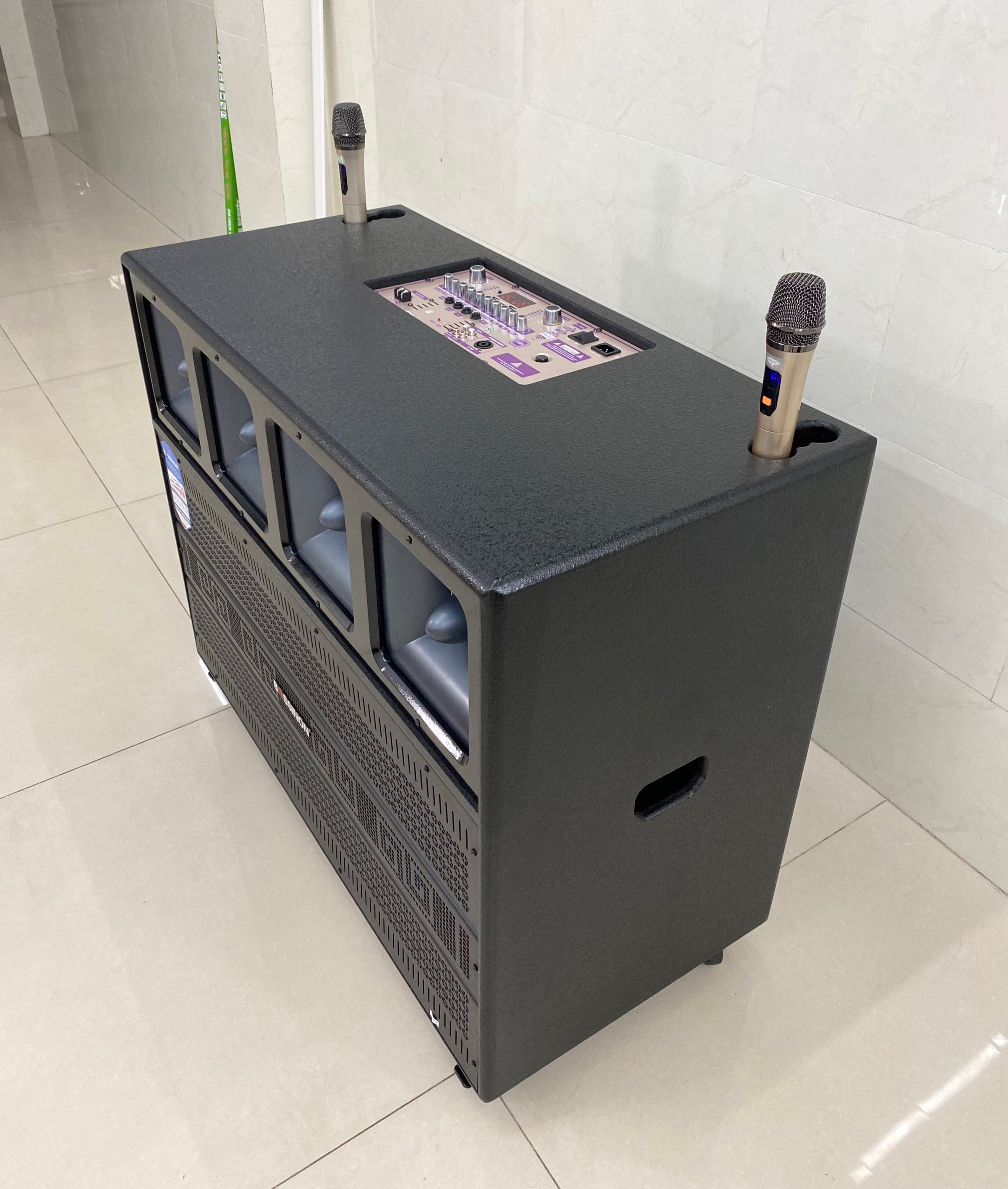 Mua tại Tiktok_Nguồn AC, Nguồn DC _Hỗ trợ Bluetooth, guitar in, mic in _Bass loa ≈40cm X 2 , Treble x 4 _Phụ kiện 2 mic cầm tay không dây _Kích thước: 995(W) x 470 (D) x 830 (H)mm Công suất: 1200Watts ĐẶC BIỆT: 2 micro không dây UHF Chống hú hát siêu nhẹ