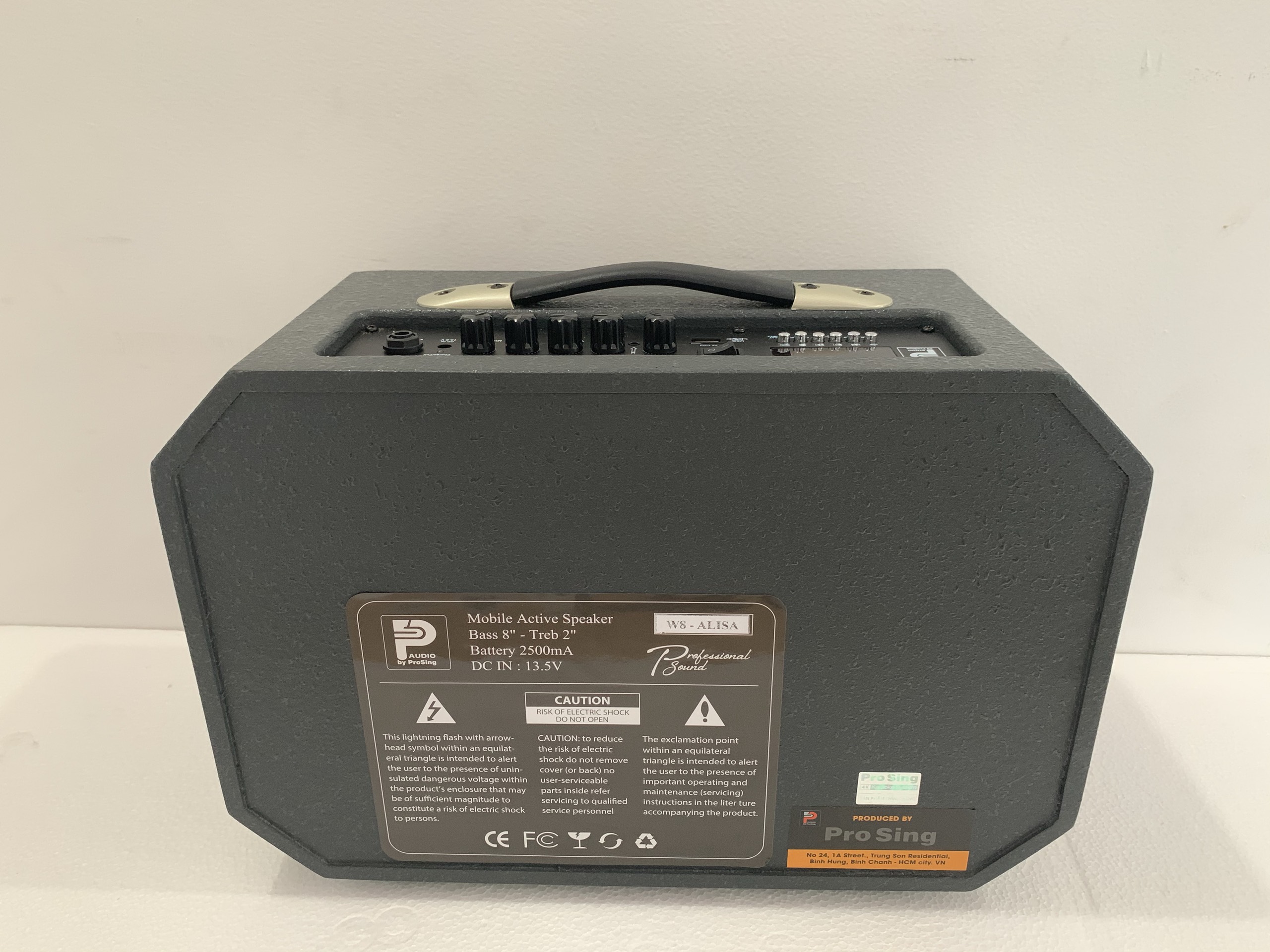 THÔNG SỐ KỸ THUẬT -Model: PROSING W8 (ALISA) -Công suất cực đại (PMPO): 520W (công suất ảo) -Công suất thực tế (RMS): 65W -Phạm vi âm thanh hay nhất: Tầm khoảng 230 mét vuông đổ lại (có dao động tuỳ