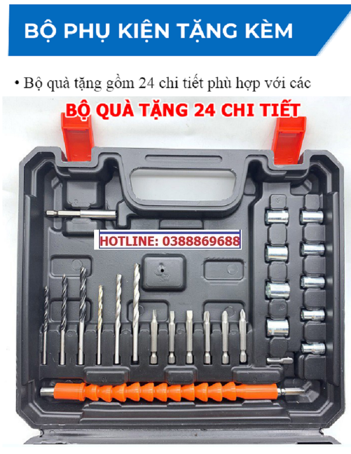 Phụ kiện bao gồm: 1 hộp máy, 1 thân máy, 1 sạc pin, 1 HOẶC 2 PIN lion , 2 mũi khoan, 1 phiếu bảo hành bán hành, 1 bộ mũi khoan đi kèm (như ảnh)