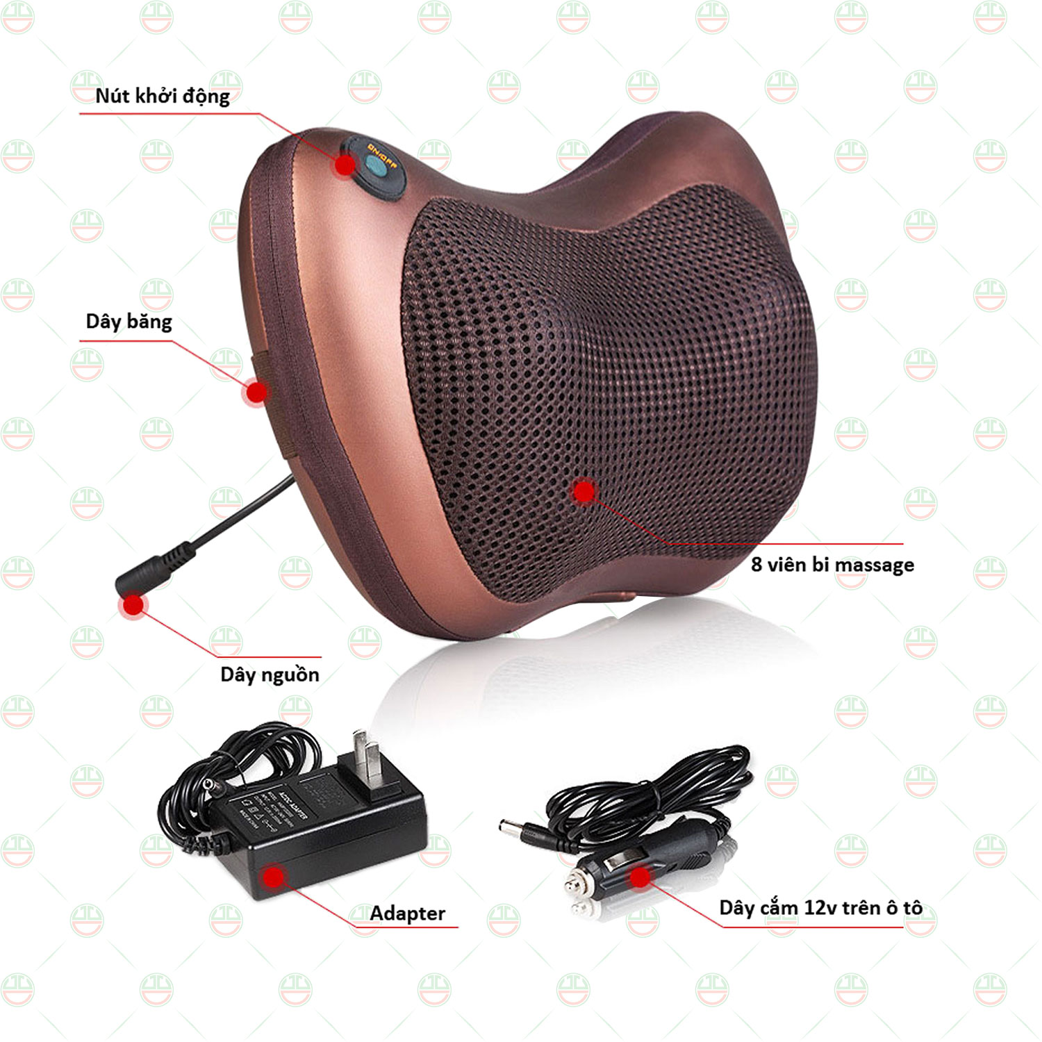 Gối massage hồng ngoại 8bi - Máy massage trị liệu THÔNG TIN SẢN PHẨM Tên sản phẩm: Gối Massage 8 Bi Car & Home * Điện nguồn: 220V / 50Hz. * Công suất: 22W. *