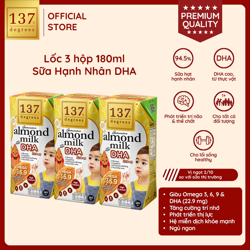 Sữa hạt 137 Degrees là thương hiệu sữa hạt dinh dưỡng số 1 tại Thái Lan, với thành phần hạt tươi nguyên chất đến 99% KHÔNG ĐƯỜNG, KHÔNG CHẤT BẢO QUẢN, KHÔNG PHA TRỘN SỮA BÒ/ SỮA ĐẬU NÀNH, dùng mật hoa dừa hữu cơ tạo vị ngọt thanh nhẹ cho sữa, nguồn hạt hạnh nhân chất lượng từ California, Hoa Kỳ.