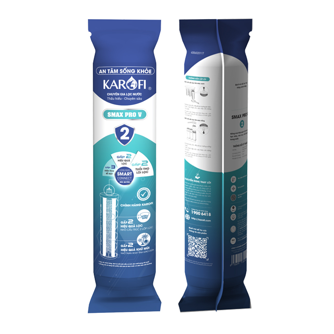 - Thời gian thay lõi khuyến nghị: 12 tháng Tổng quan về lõi Smax Pro V2 Không chỉ nhân đôi tuổi thọ, gấp đôi hiệu quả; hệ lõi Smax Pro V còn đột phá hơn với công nghệ Smart Connect, an tâm chính hãng, kết nối thông mình đem lại những trải nghiệm vượt trội. Cấu tạo 2 lớp đặc biệt Điểm đặc biệt của công nghệ Smax Pro V đến từ cấu tạo 2 chức năng kết hợp: Bên ngoài là màng vi lọc gồm các chuỗi vi sợi liên kết kích thước nhỏ kết hợp với than hoạt tính bên trong. Lợi ích các lớp Cụ thể, màng vi lọc ở lớp ngoài giúp loại bỏ các tạp chất, cặn bẩn, rong rêu,... Bên trong là than hoạt tính giúp nâng cao xử lý kép cả các chất hữu cơ, chất gây mùi, chất tạo màu, mùi clo có trong nước sinh hoạt hàng ngày.
