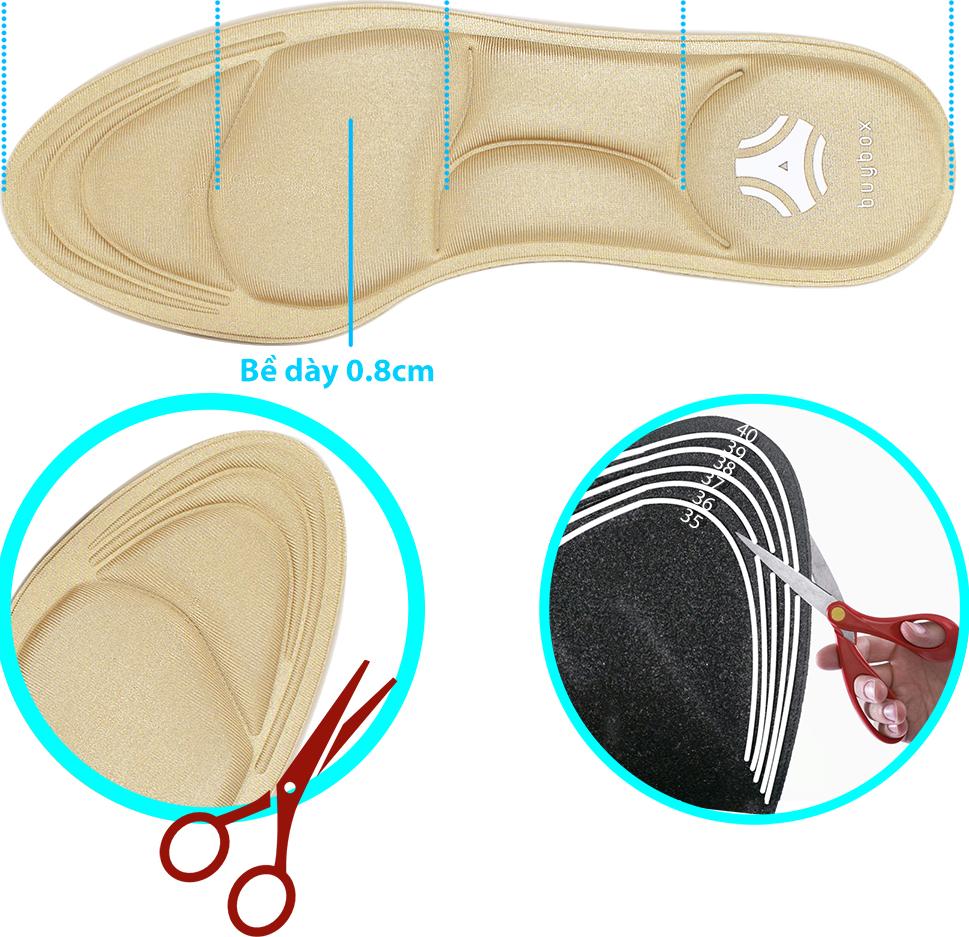 - Từ nay không còn phải lo lắng nữa vì đã có lót giày đa năng 4D buybox giúp êm chân & chống hôi chân. CÔNG DỤNG NỔI BẬT Loại lót giày nguyên bàn chân, thiết kế 4D cực êm Sản phẩm có thể giặt sạch bằng xà phòng nhẹ và tái sử dụng nhiều lần, dễ tháo lấp Giày đi lâu ngày, phần lót giày bị lún, lót vào đi êm chân hơn, thoải mái. Sản phẩm thiết kế 4D, kết hợp 2 trong 1 vừa bảo vệ chân, chống được mồ hôi chân. Được làm từ chất liệu cao cấp rất êm chân, thoáng khí & bền bỉ. Mặt dưới miếng lót in các đường cong tương ứng các size 35 - 36 - 37 - 38 - 39 - 40. Dùng kéo cắt theo các đường cong này để có được kích thước cần sử dụng. Lót giày đa năng 4D sử dụng được cho nhiều loại giày khác nhau như: giày cao gót mũi nhọn, giày búp bê mũi nhọn, giày mọi, giày lười, giày thể NGỮ CẢNH SỬ DỤNG