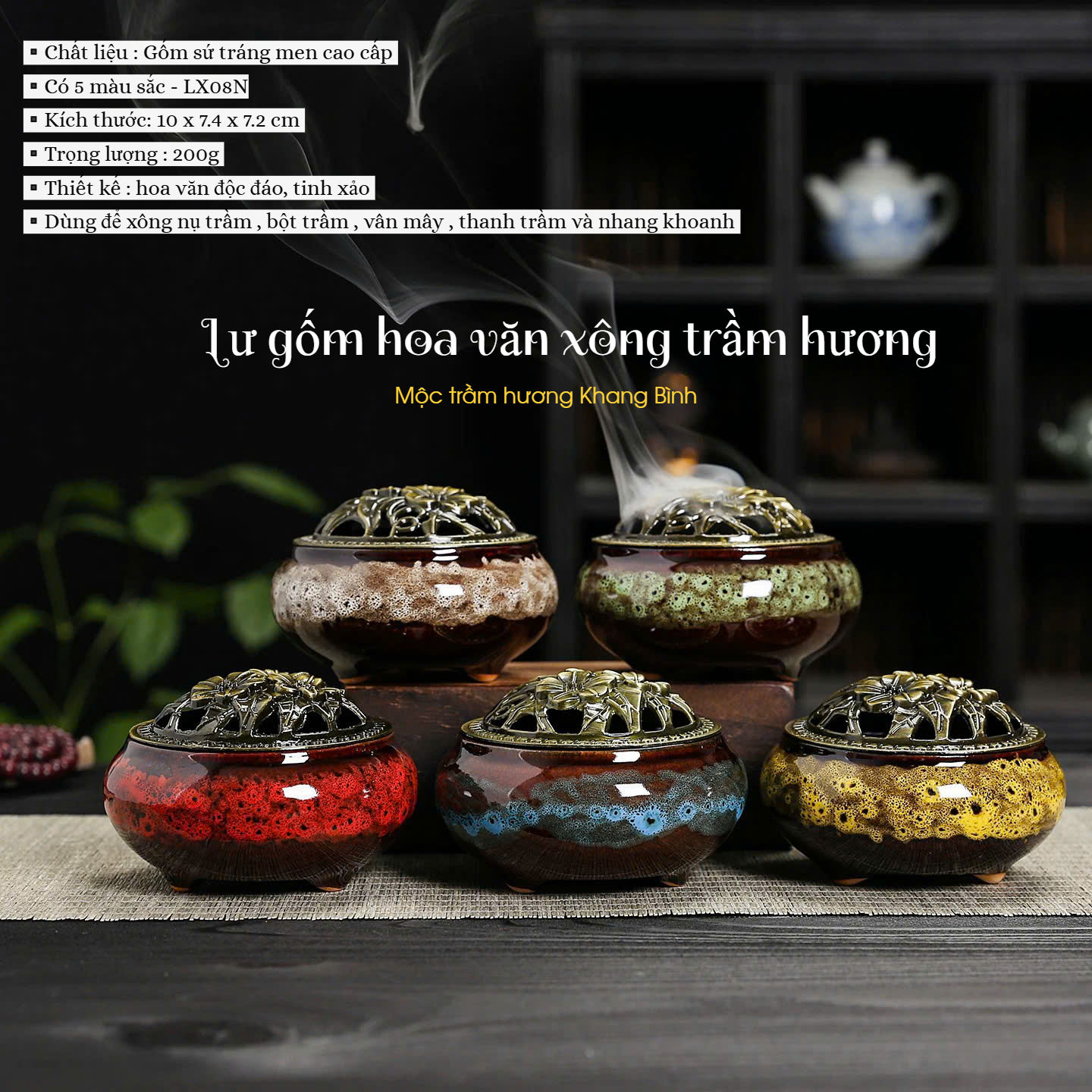 -Lư xông trầm bằng gốm có tấm lót chống nóng , chống ố vàng đáy lư , lư hương sứ kèm đế cắm được tất cả các loại nhang , giúp tạo ra bầu không