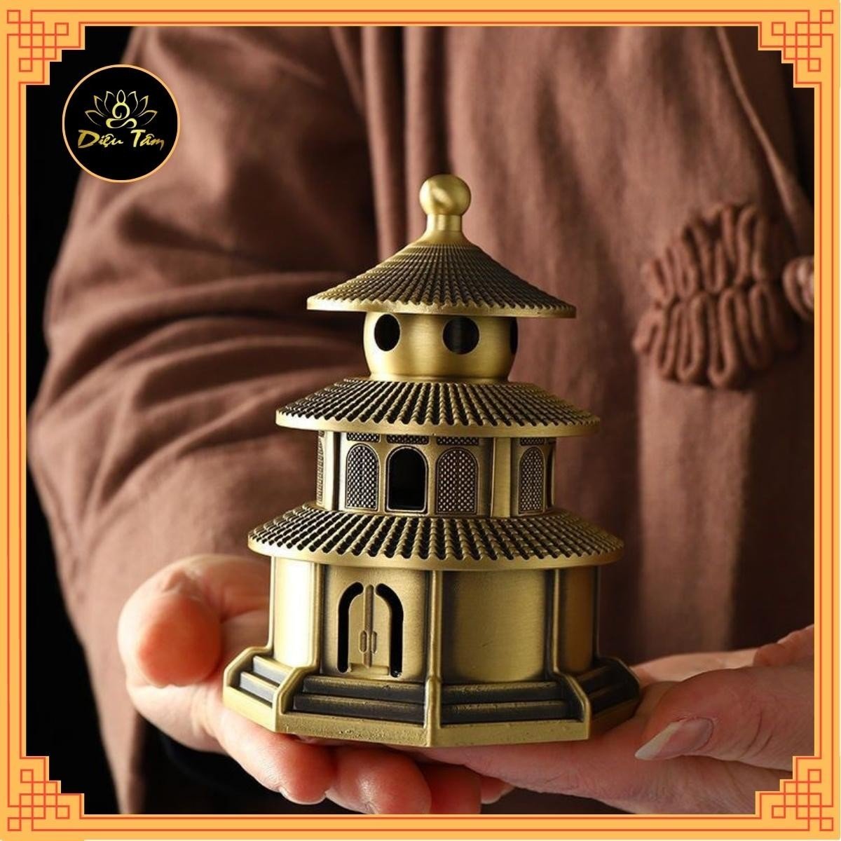 Lư xông trầm đồ thờ cúng bằng đồng hình bảo tháp sơn màu đồng vàng phụ kiện trang trí ban thờ, bàn làm việc