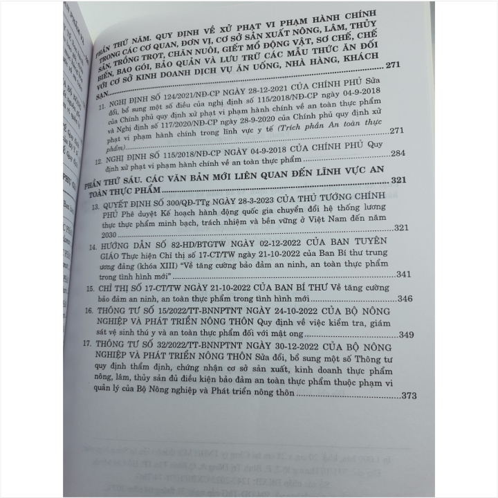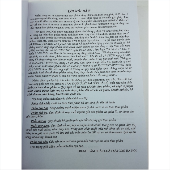 - Thông tư số 32/2022/TT-BNNPTNT ngày 30-12-2022 Sửa đổi, bổ sung một số Thông tư quy định thẩm định, chứng nhận cơ sở sản xuất, kinh doanh thực phẩm nông, lâm, thủy sản đủ điều kiện bảo đảm an toàn thực phẩm thuộc phạm vi quản lý của Bộ Nông nghiệp và Phát triển nông thôn;Nhằm phổ biến đến Quý Cơ quan, Đơn vị và Quý khách hàng thân thiết nắm bắt kịp thời những quy định mới nêu trên. Nhà sách Nam Việt xin trân trọng giới thiệu cuốn sách: Luật An Toàn Thực Phẩm – Quy Định Về An Toàn Vệ Sinh Thực Phẩm, Xử Phạt Vi Phạm Hành Chính Trong Lĩnh Vực An Toàn Thực Phẩm Đối Với Các Cơ Quan, Doanh Nghiệp, Hộ Kinh Doanh, Nhà Hàng, Khách Sạn, Quán Ăn ***Nội dung cuốn sách gồm 6 phần sau đây:Phần thứ nhất. Luật An toàn thực phẩm và quy định chi tiết thi hành mới nhấtPhần thứ hai. Tăng cường trách nhiệm quản lý nhà nước về an toàn thực phẩmPhần thứ ba. Quy định về truy xuất nguồn gốc sản phẩm và quản lý, sử dụng phụ gia thực phẩmPhần thứ tư. Quy chuẩn kỹ thuật quốc gia đối với phụ gia thực phẩmPhần thứ năm. Quy định về xử phạt vi phạm hành chính trong các cơ quan, đơn vị, cơ sở sản xuất nông, lâm, thủy sản, trồng trọt, chăn nuôi, giết mổ động vật, sơ chế, chế biến, bao gói, bảo quản và lưu trữ các mẫu thức ăn đối với cơ sở kinh doanh dịch vụ ăn uống, nhà hàng, khách sạnPhần thứ sáu. Các văn bản mới liên quan đến lĩnh vực an toàn thực phẩm Cảm ơn các bạn đã ghé thăm shop Nhà sách Nam Việt ! Sách Luật An Toàn Thực Phẩm – Quy Định Về An Toàn Vệ Sinh Thực Phẩm, Xử Phạt Vi Phạm Hành Chính Trong Lĩnh Vực An Toàn Thực Phẩm Đối Với Các Cơ Quan, Doanh Nghiệp, Hộ Kinh Doanh, Nhà Hàng, Khách Sạn, Quán Ăn Sách Luật An Toàn Thực Phẩm – Quy Định Về An Toàn Vệ Sinh Thực Phẩm, Xử Phạt Vi Phạm Hành Chính Trong Lĩnh Vực An Toàn Thực Phẩm Đối Với Các Cơ Quan, Doanh Nghiệp, Hộ Kinh Doanh, Nhà Hàng, Khách Sạn, Quán Ăn
