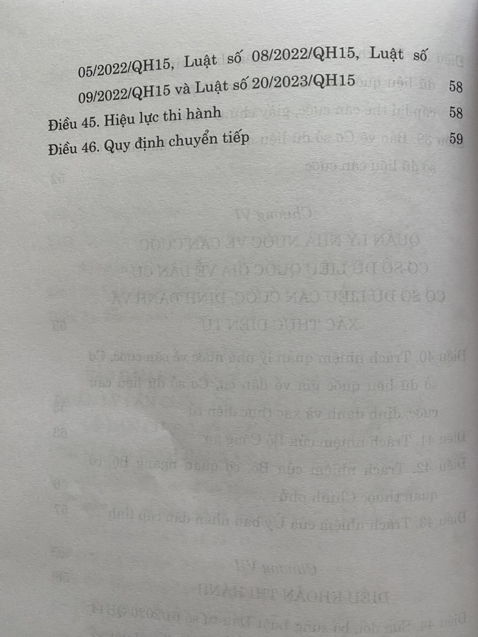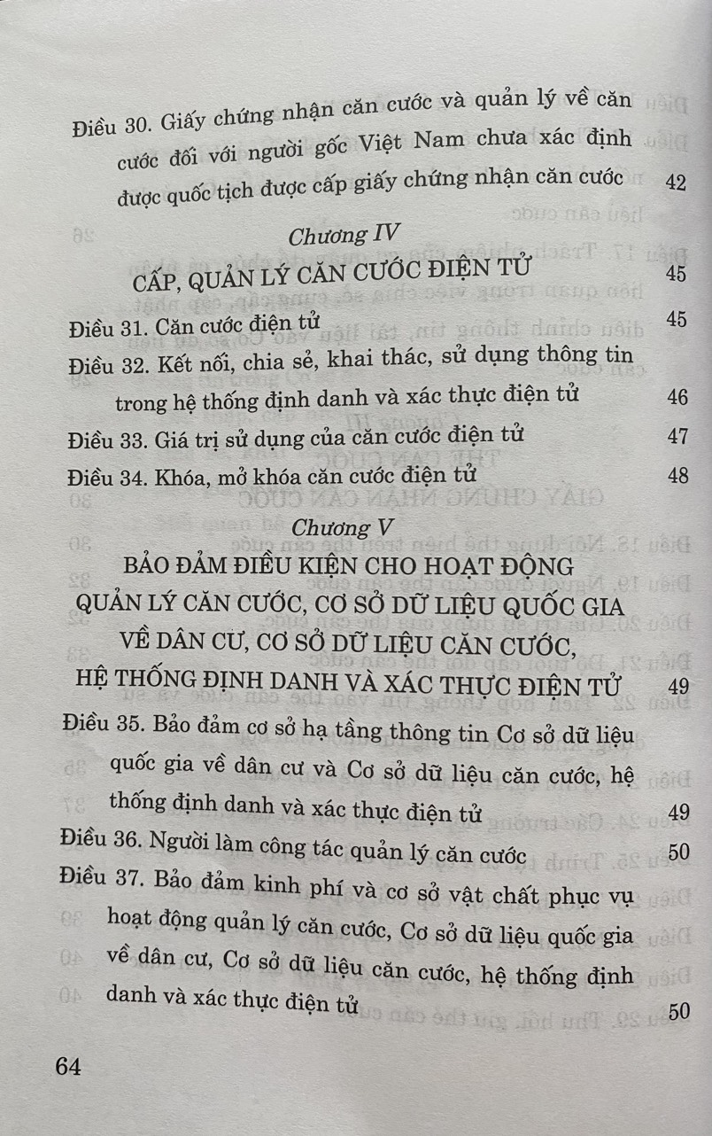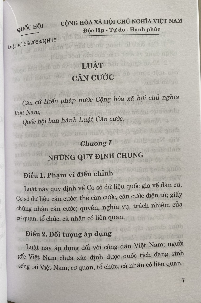 LUẬT CĂN CƯỚC ( Theo Luật số 26/2023/QH15 áp dụng từ ngày 01-07-2024) Luật này quy định về Cơ sở dữ liệu quốc gia về dân cư, Cơ sở dữ liệu căn cước; thẻ căn cước, căn cước điện tử; giấy chứng nhận căn cước; quyền, nghĩa vụ, trách nhiệm của cơ quan, tổ chức, cá nhân có liên quan.