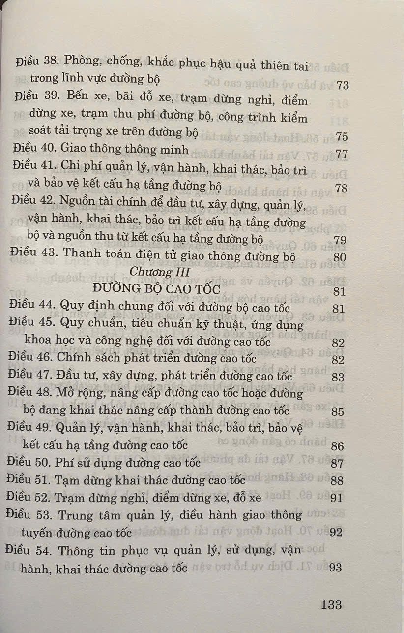 Luật Đường Bộ số 35/2024/QH15 được Quốc hội nước Cộng hòa xã hội chủ nghĩa Việt Nam khóa XV, kỳ họp thứ 7 thông qua ngày 27 tháng 6 năm 2024 . Luật Đường bộ năm 2024 gồm 6 chương và 86 điều quy định về quy hoạch, đầu tư, xây dựng, quản lý, vận hành, khai thác, bảo trì, bảo vệ kết cấu hạ tầng đường bộ; tổ chức vận tải đường bộ và quản lý nhà nước về hoạt động đường bộ. Luật có hiệu lực áp dụng từ ngày 01 -01-2025.