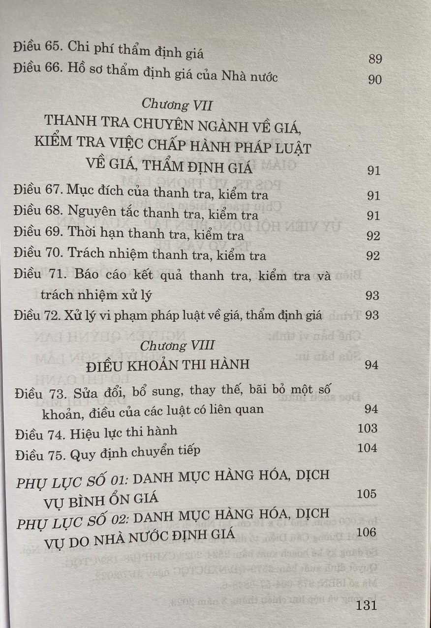 Trên cơ sở đó, ngày 19/6/2023, tại kỳ họp thứ 5, Quốc hội khóa XV đã thông qua Luật Giá năm 2023, thay thế Luật Giá năm 2012. Luật gồm 8 chương, 75 điều, quy định về quyền và nghĩa vụ của cơ quan, tổ chức, cá nhân, người tiêu dùng trong lĩnh vực giá, thẩm định giá; hoạt động quản lý, điều tiết giá của Nhà nước; tổng hợp, phân tích, dự báo giá thị trường; cơ sở dữ liệu về giá; thẩm định giá; thanh tra chuyên ngành về giá, kiểm tra việc chấp hành pháp luật về giá, thẩm định giá. Luật có hiệu lực thi hành từ ngày 01/7/2024.