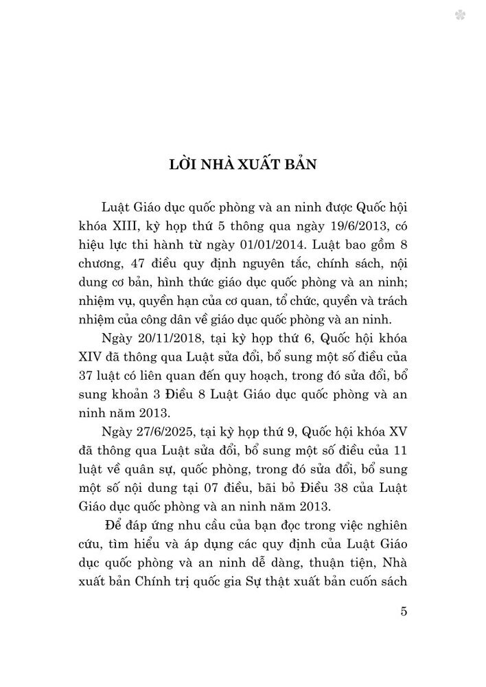 Luật Giáo dục quốc phòng và an ninh năm 2013 (sửa đổi, bổ sung năm 2018, 2025) do Nhà xuất bản Chính trị quốc gia Sự thật phát hành là tài liệu pháp lý quan