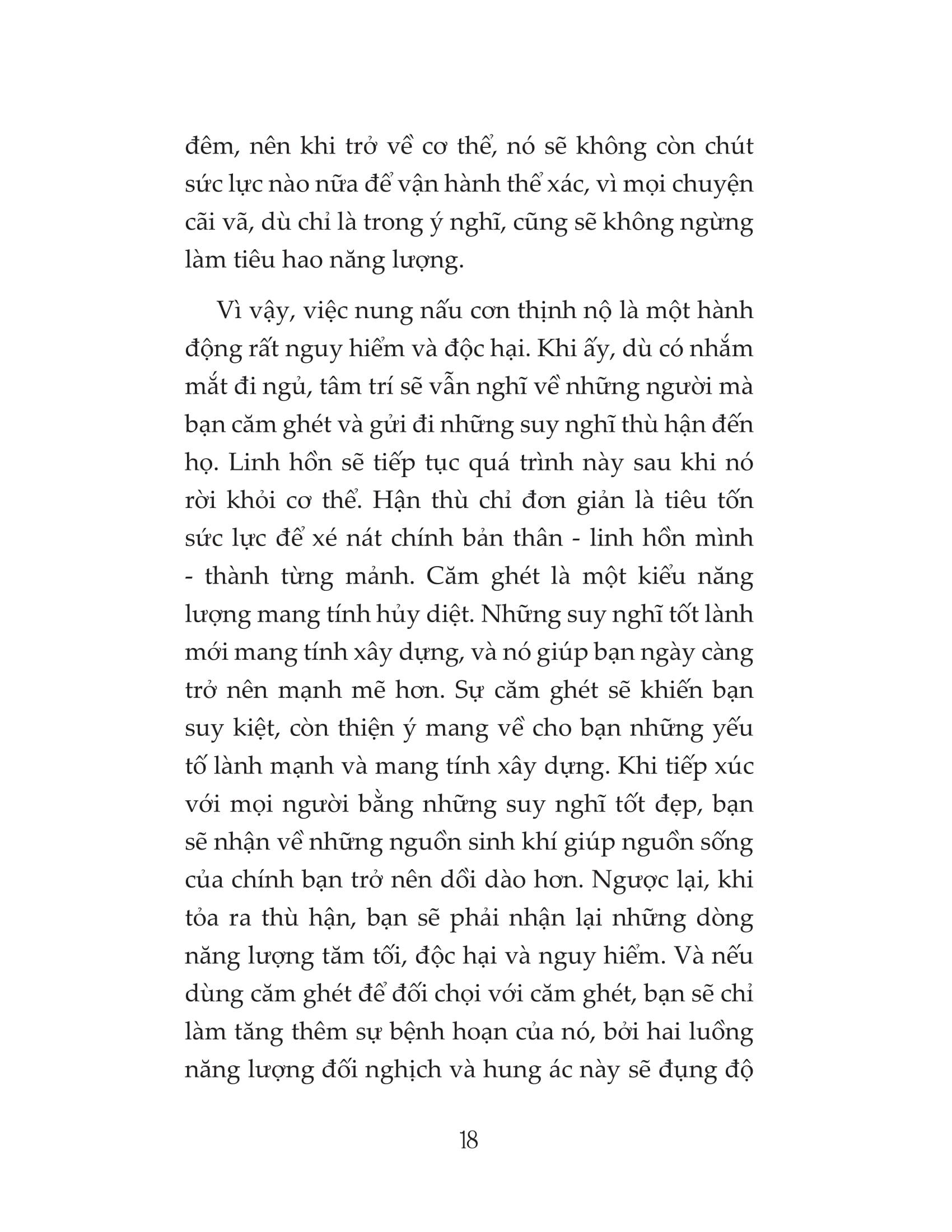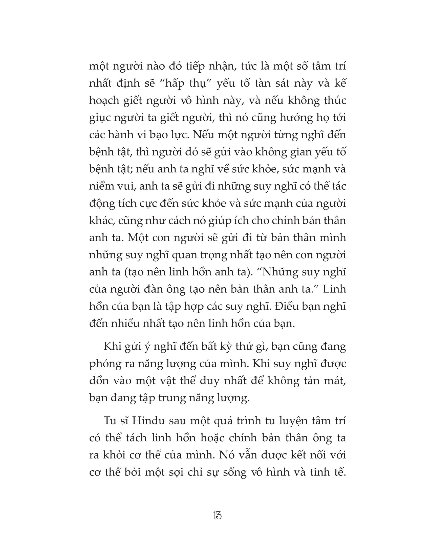 Cách chúng ta suy nghĩ tạo nên thực tế cuộc sống của chúng ta. Nuôi dưỡng tâm trí và linh hồn chính là nuôi dưỡng con người chân thực của mình, để chữa lành bản thân từ bên trong và khơi gợi những sức mạnh tiềm ẩn. Cuốn sách này xoay quanh Luật Hấp dẫn, diễn giải những quy luật tâm thức đã luôn tồn tại và không ngừng hiện hữu trong mọi khía cạnh hoạt động của con người, giúp chúng ta thấu hiểu và bắt đầu học cách sử dụng nguồn năng lượng khổng lồ đang ẩn sâu trong cơ thể, để can đảm tiến bước trên hành trình dựng xây sự nghiệp và cuộc đời viên mãn mà ta mong muốn. Thông tin tác giả: Prentice Mulford (1834-1891) là cây viết Mỹ đóng vai trò quan trọng trong quá trình phát triển của phong trào Tư tưởng Mới. Nhiều nguyên tắc và quy luật tiêu biểu của phong trào đã được Mulford trình bày chi tiết trong những bài luận xuất bản vào năm tháng cuối đời. Ông dành nhiều tâm sức để viết về Luật Hấp dẫn - quy luật đã truyền cảm hứng và đặt nền tảng cho nguyên tắc tư duy tích cực, đồng thời là một quy luật vẫn đang không ngừng được ứng dụng trong xã hội hiện đại. Một số trích dẫn hay “Hãy đối đầu với lòng căm thù của người khác bằng trái tim nhân hậu, bởi ý nghĩ tốt lành lương thiện mãi mãi mạnh mẽ hơn ý nghĩ xấu xa” “Suy nghĩ của bạn quyết định cuộc đời của bạn” “Cơ thể của bạn không phải là con người thật của bạn. Linh hồn mới là sức mạnh khiến cơ thể hoạt động theo ý bạn muốn. Linh hồn là một sự cấu tạo vô hình, khá tách biệt với cơ thể. Linh hồn, hay con người thật của bạn, sử dụng cơ thể giống như cách một người thợ mộc dùng búa để làm việc.” “Những suy nghĩ vô hình và không được nói ra vẫn luôn tỏa ra từ chúng ta như một dòng chảy năng lượng, tựa như một dòng nước mà ta có thể nhìn thấy, hoặc một dòng điện mà ta không thể nhìn thấy.”