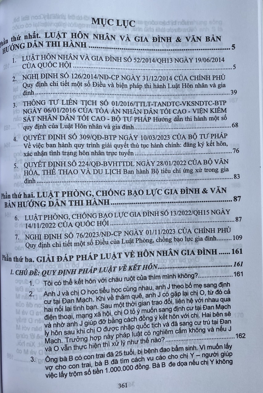 Mục lục: Chương 1: Những quy định chung Chương 2: Kết hôn Chương 3: Quan hệ giữa và chồng Chương 7: Cấp dưỡng Chương 8: Quan hệ hôn nhân và gia đinh có yếu tố
