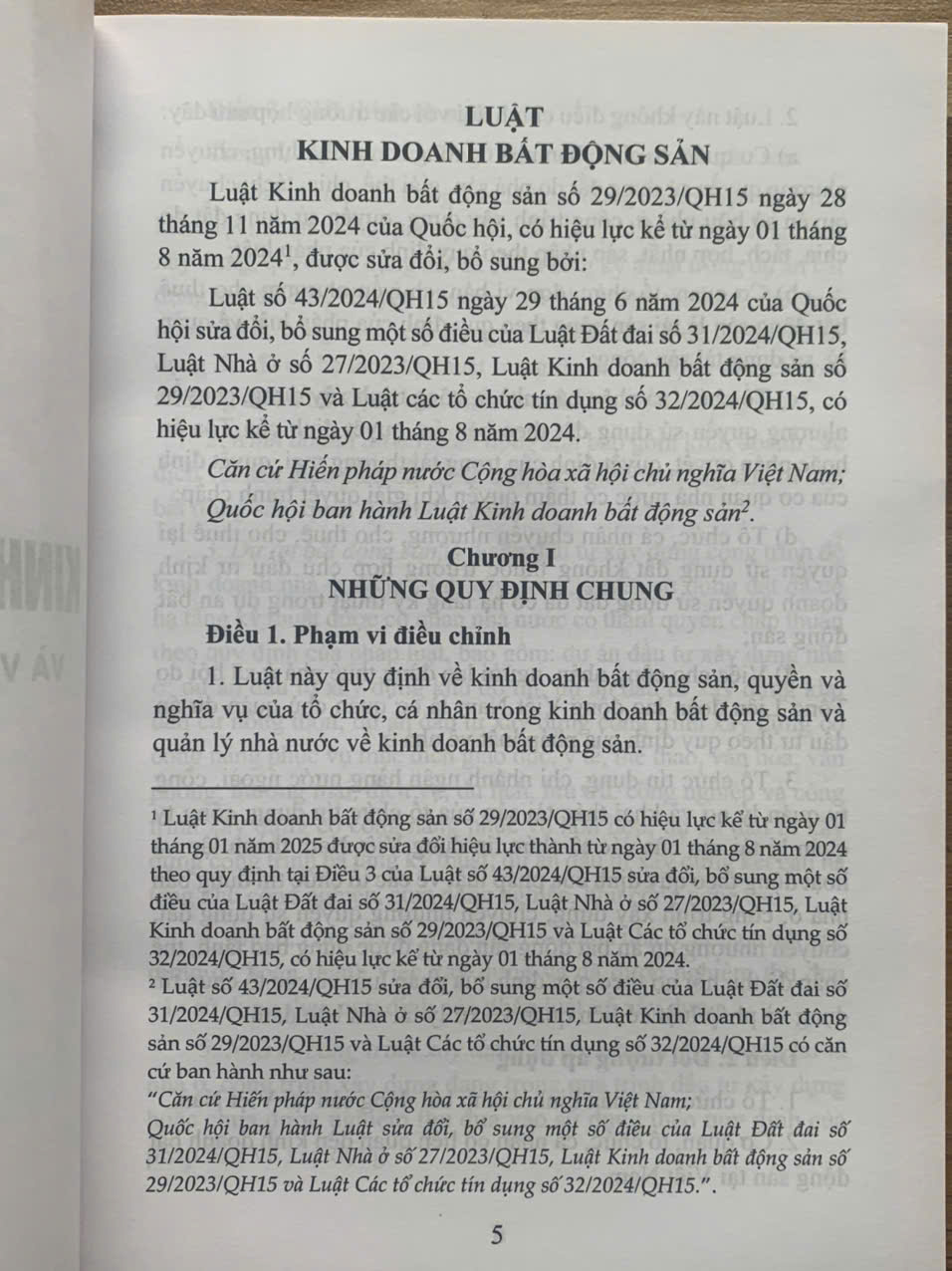 Mua tại TiktokSách Luật Kinh doanh bất động sản và văn bản hướng dẫn thi hành Tác giả: Quốc Hội Nhà xuất bản: Lao Động Công ty phát hành: Dân Hiền Ngày phát hành: 2.2025 Khổ sách: 14,5*20,5cm Số trang: 492 trang Hình thức bìa: bìa mềm Giá bìa: 180.000 đ Nội dung cuốn sách gồm 2 phần Phần 1: Luật Kinh doanh bất động sản Luật số 29/2023/QH15, có hiệu lực từ ngày 01/08/2024. Phần 2: Các nghị định Nghị định số 96/2024/NĐ-CP, ngày 24 tháng 7 năm 2024: QUY ĐỊNH CHI TIẾT MỘT SỐ ĐIỀU CỦA LUẬT KINH DOANH BẤT ĐỘNG SẢN Nghị định số 94/2024/NĐ-CP, ngày 24 tháng 7 năm 2024: QUY ĐỊNH CHI TIẾT MỘT SỐ ĐIỀU CỦA LUẬT KINH DOANH BẤT ĐỘNG SẢN VỀ XÂY DỰNG VÀ QUẢN LÝ HỆ THỐNG THÔNG TIN, CƠ SỞ DỮ LIỆU VỀ NHÀ Ở VÀ THỊ TRƯỜNG BẤT ĐỘNG SẢN
