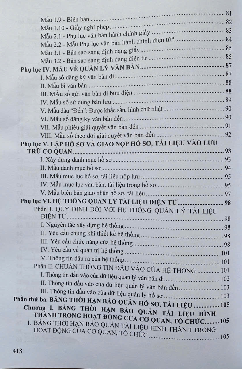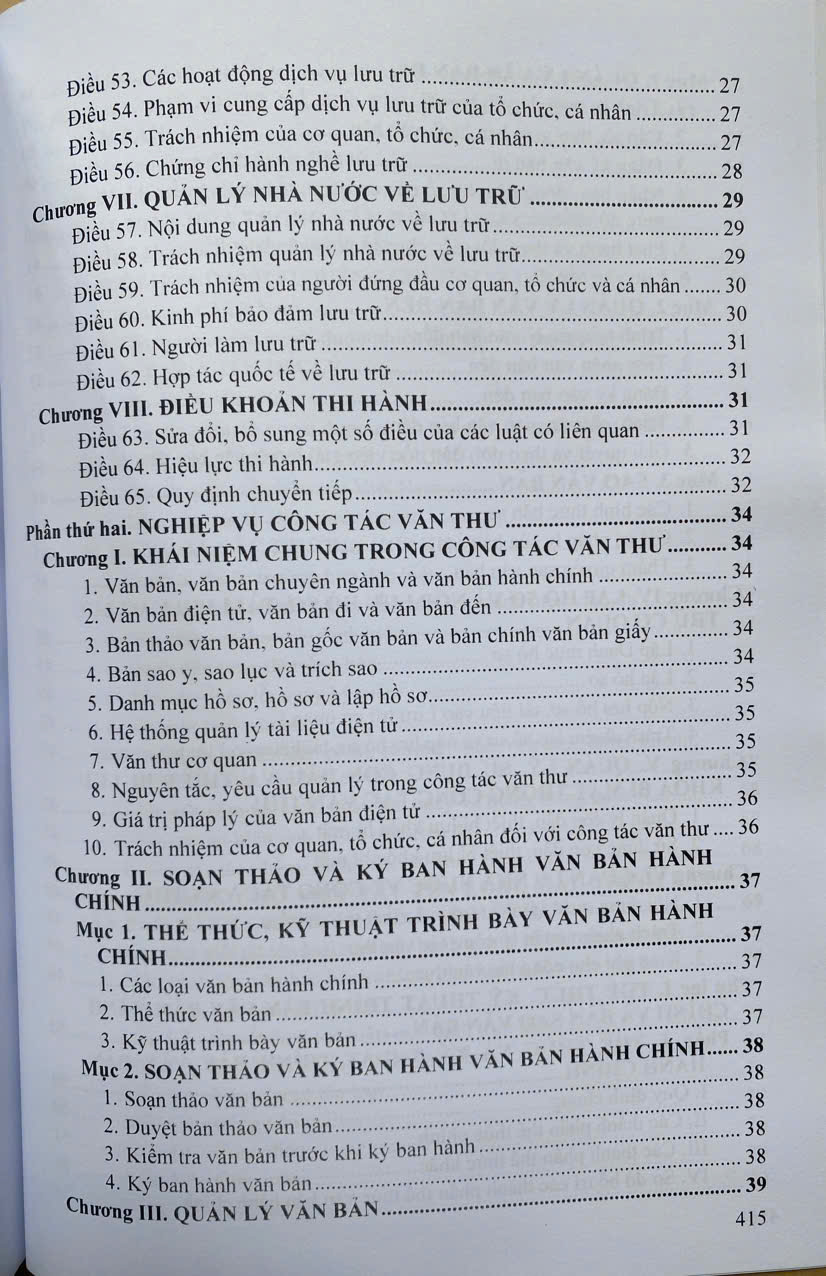 Mua tại TiktokNgày 21 tháng 6 năm 2024, tại kỳ họp thứ 7, Quốc hội khóa XV đã thông qua Luật Lưu trữ. Nhằm giúp việc quản lý và nâng cao nghiệp vụ của công tác văn thư, lưu trữ trong việc soạn thảo, ký ban hành văn bản; quản lý văn bản; lập hồ sơ và nộp lưu hồ sơ, tài liệu vào Lưu trữ cơ quan, hướng dẫn hoạt động thu thập, chỉnh lý, xác định giá trị, thời hạn bảo quản, thống kê, sử dụng tài liệu lưu trữ. Nội dung cuốn sách bao gồm những phần sau: -Phần thứ nhất. LUẬT LƯU TRỮ (được Quốc hội nước Cộng hòa xã hội chủ nghĩa Việt Nam khóa XV, kỳ họp thứ 7 thông qua ngày 21 tháng 6 năm 2024) -Phần thứ hai. NGHIỆP VỤ CÔNG TÁC VĂN THƯ -Phần thứ ba. BẢNG THỜI HẠN BẢO QUẢN HỒ SƠ, TÀI LIỆU Luatvietbook xin giới thiệu cuốn sách đến bạn đọc!