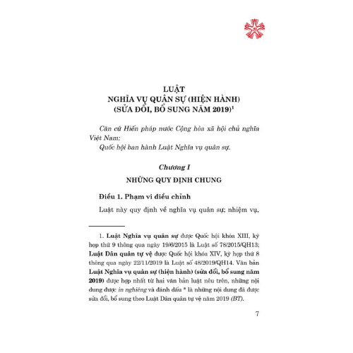 Để tạo điều kiện thuận lợi cho bạn đọc trong việc tìm hiểu và áp dụng Luật, Nhà xuất bản Chính trị quốc gia Sự thật tái bản cuốn sách Luật Nghĩa vụ quân sự (hiện hành) (sửa đổi, bổ sung năm 2019). Nội dung cuốn sách là văn bản được hợp nhất từ Luật Nghĩa vụ quân sự năm 2015 và nội dung sửa đổi, bổ sung của Luật Dân quân tự vệ năm 2019.