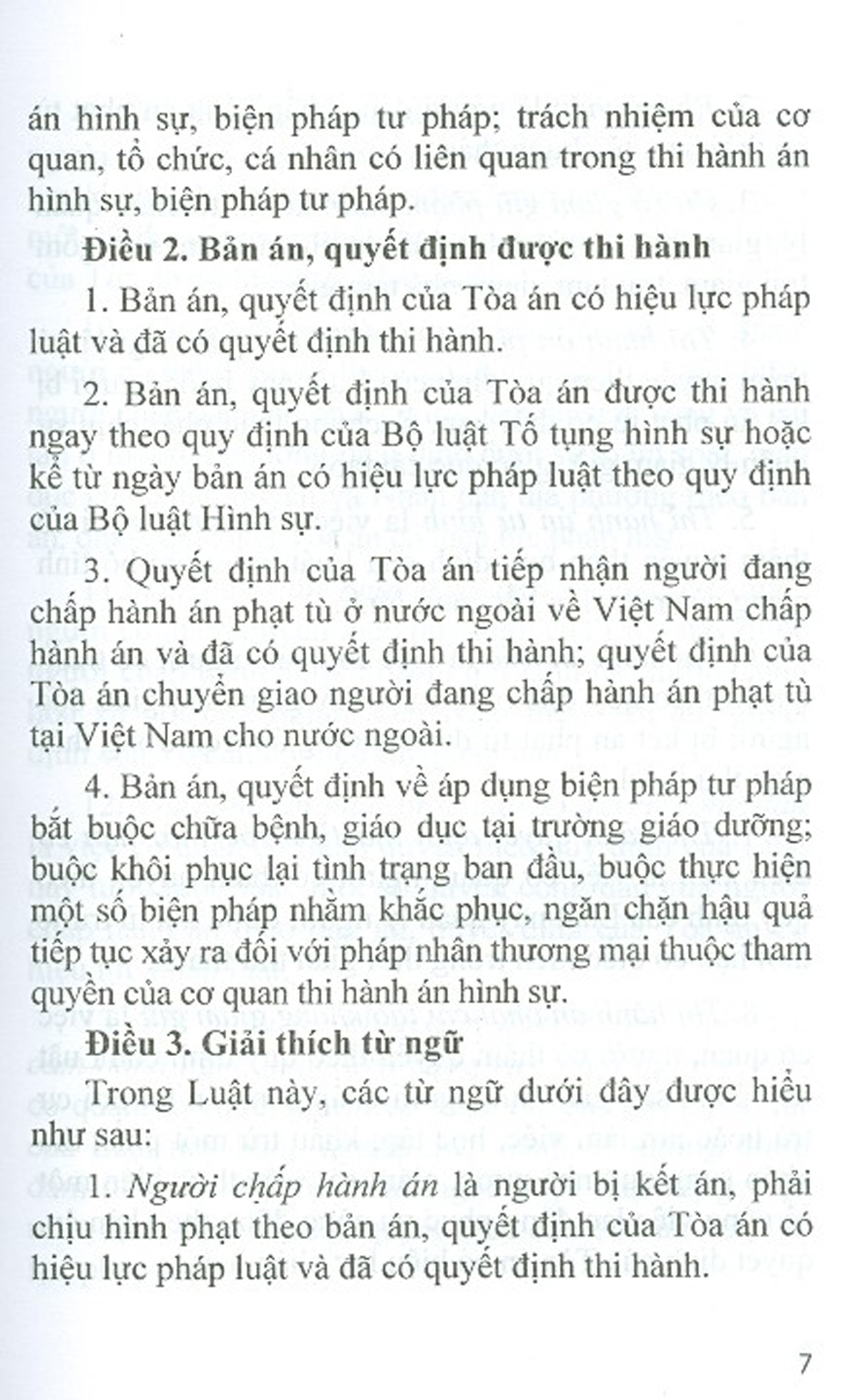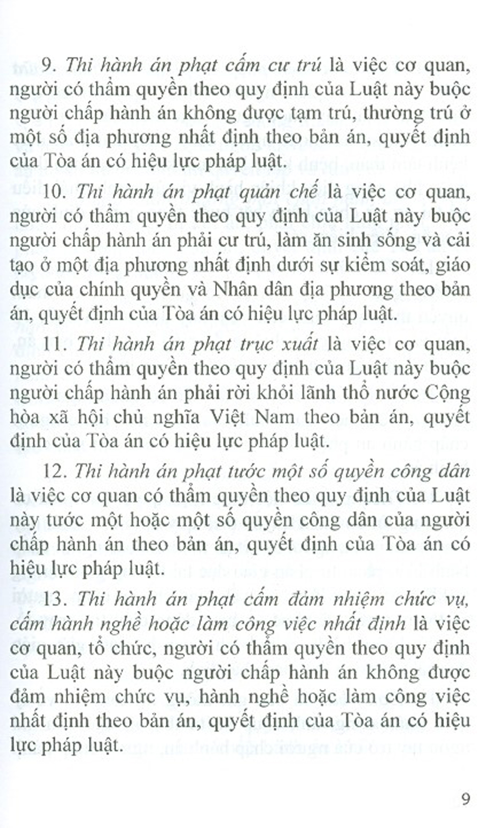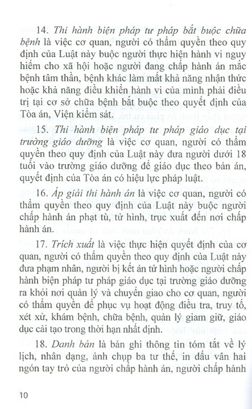 Mua tại TiktokTrình bày nội dung Luật Thi hành án hình sự với những quy định chung và quy định cụ thể về hệ thống tổ chức thi hành án hình sự, nhiệm vụ, quyền hạn của cơ quan có thẩm quyền trong thi hành án hình sự; thi hành án phạt tù, tử hình, án treo, án phạt cảnh cáo, cải tạo không giam giữ, cấm cư trú, quản chế và các điều khoản thi hành