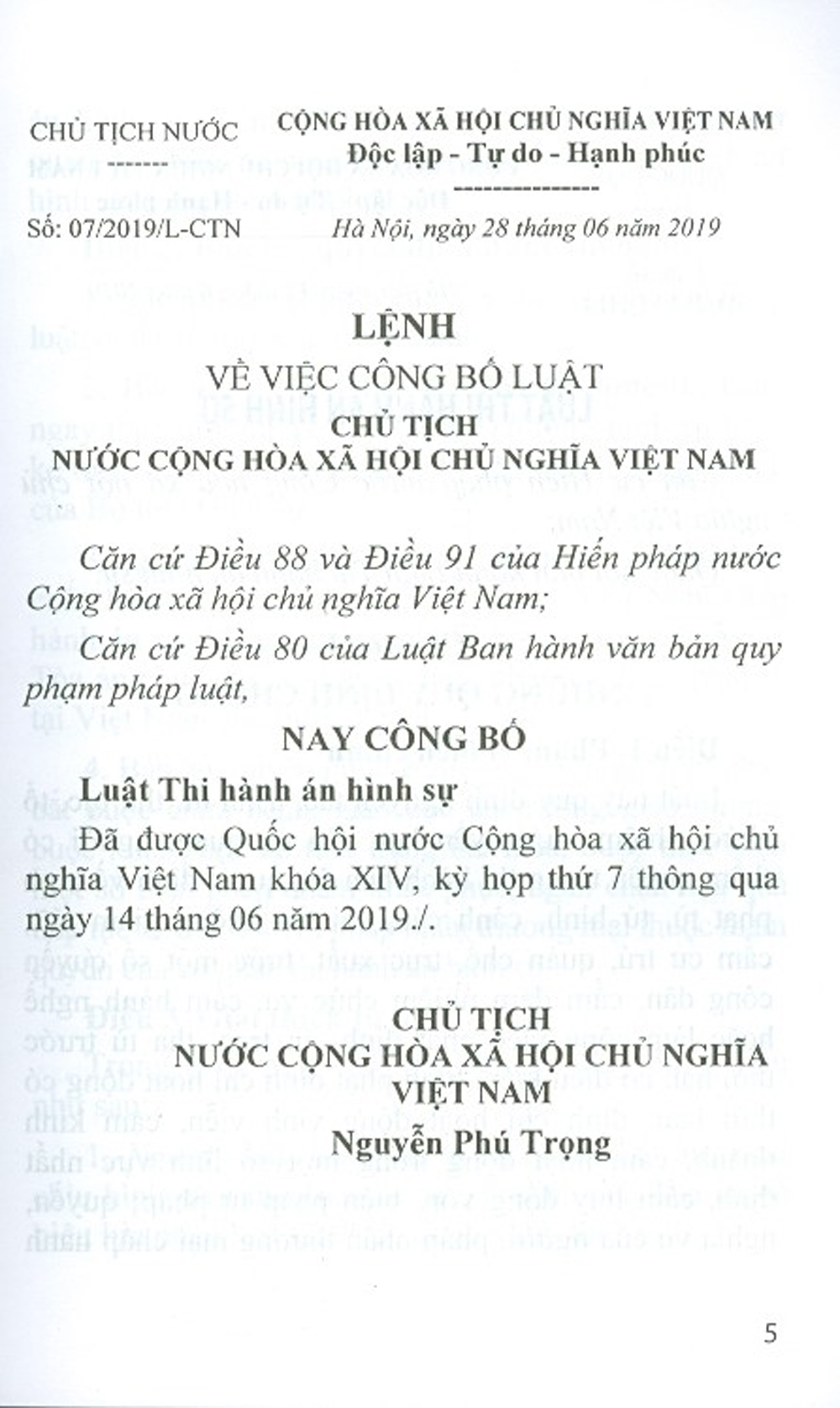 Luật Thi hành án hình sự được Quốc hội nước Cộng hòa xã hội chủ nghĩa Việt Nam khóa XIV, kỳ họp thứ 7 thông qua ngày 14/6/2019, có hiệu lực thi hành 01/01/2020. Luật