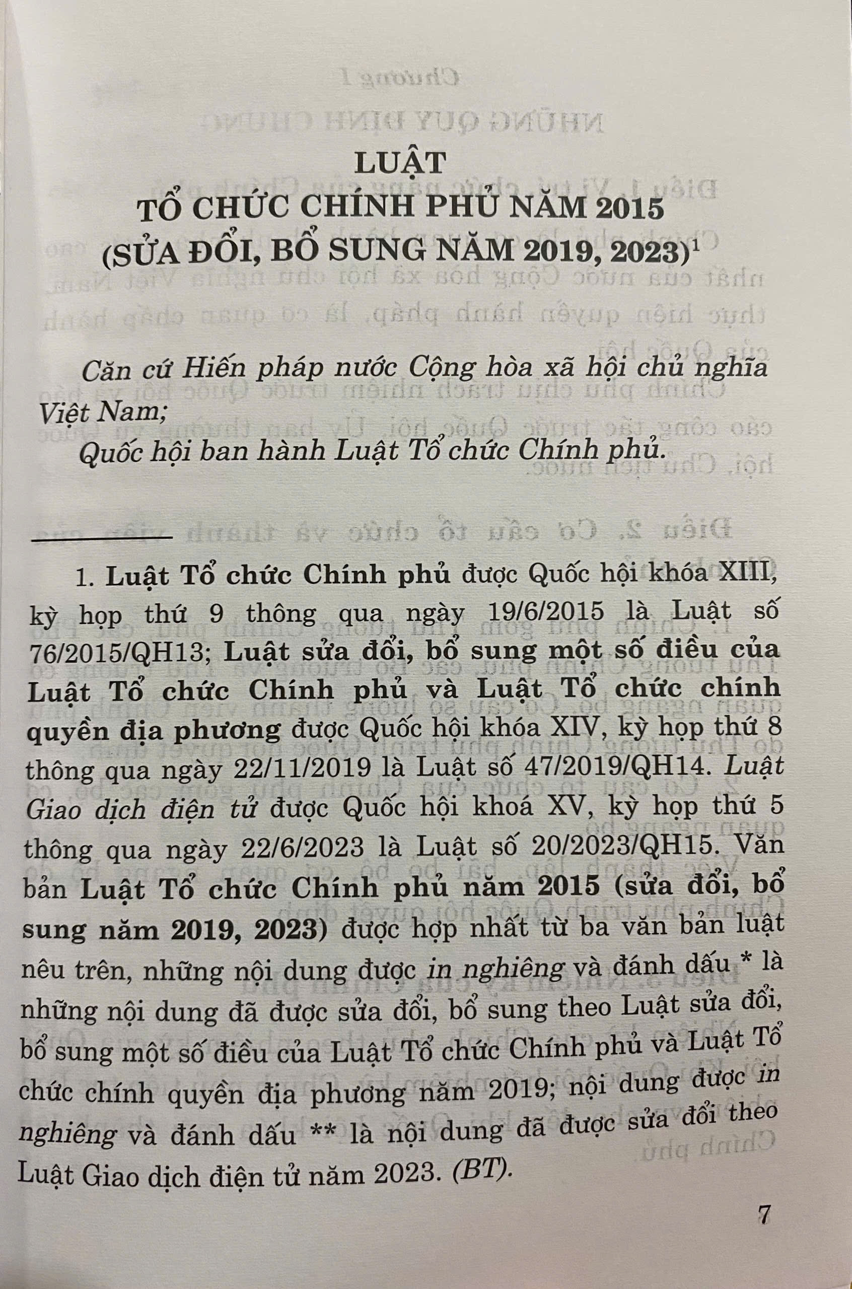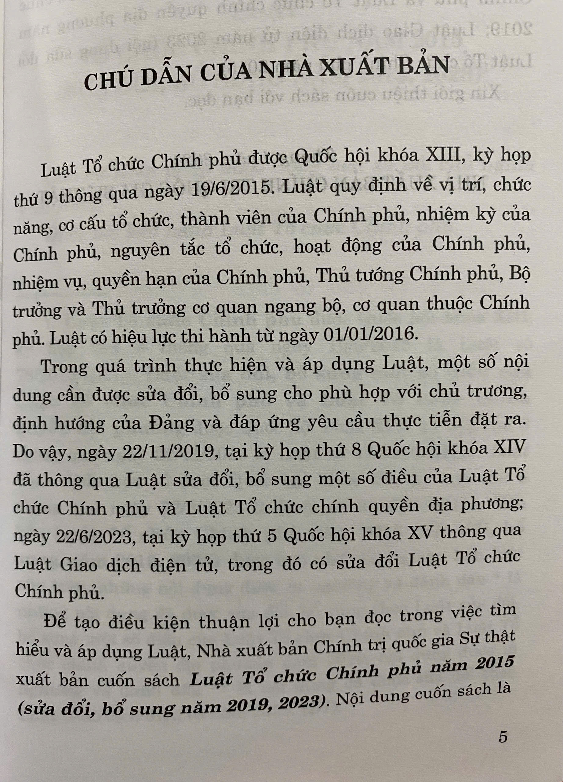 Để tạo điều kiện thuận lợi cho bạn đọc trong việc tìm hiểu và áp dụng Luật, Nhà xuất bản Chính trị quốc gia Sự thật xuất bản cuốn sách Luật Tổ chức Chính phủ năm 2015 (sửa đổi, bổ sung năm 2019, 2023). Nội dung cuốn sách là văn bản được hợp nhất từ Luật Tổ chức Chính phủ năm 2015; Luật sửa đổi, bổ sung một số điều của Luật Tổ chức Chính phủ và Luật Tổ chức chính quyền địa phương năm 2019; Luật Giao dịch điện tử năm 2023 (nội dung sửa đổi Luật Tổ chức Chính phủ năm 2015).