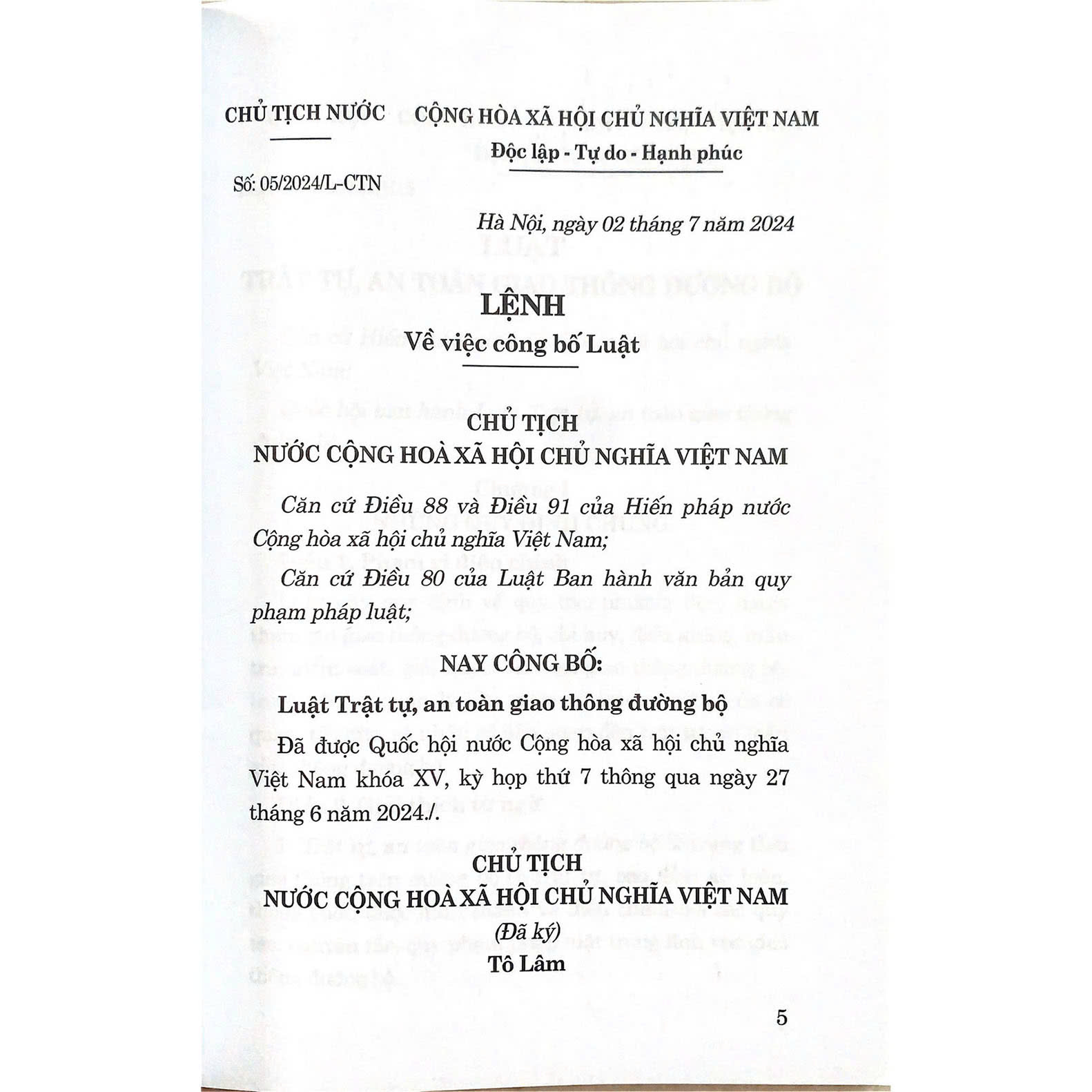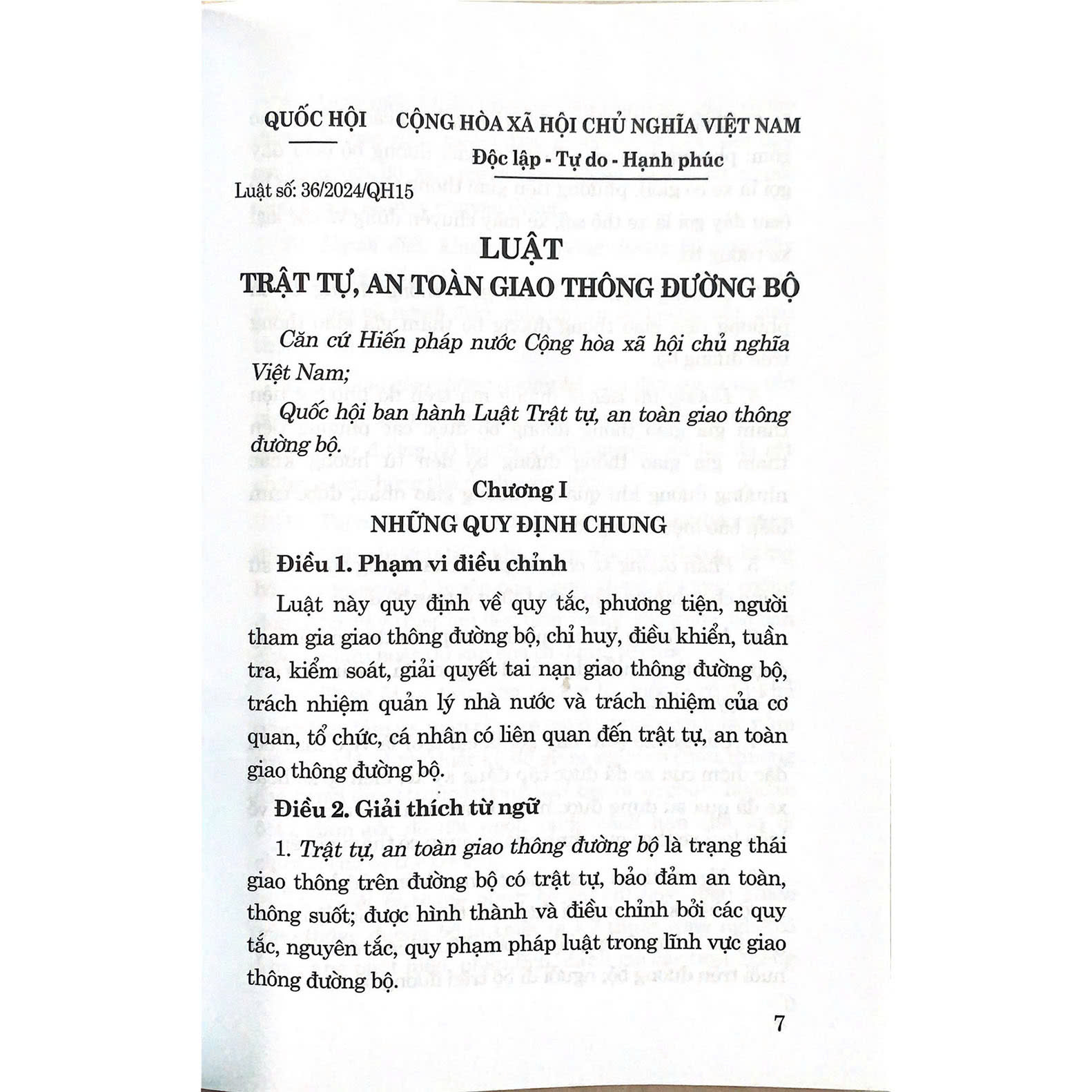 - Số trang: 152 trang Giới thiệu: Luật Trật tự, an toàn giao thông đường bộ Đã được Quốc hội nước Cộng hòa xã hội chủ nghĩa Việt Nam khóa XV, kỳ họp thứ 7 thông qua ngày 27 tháng 6 năm 2024./.