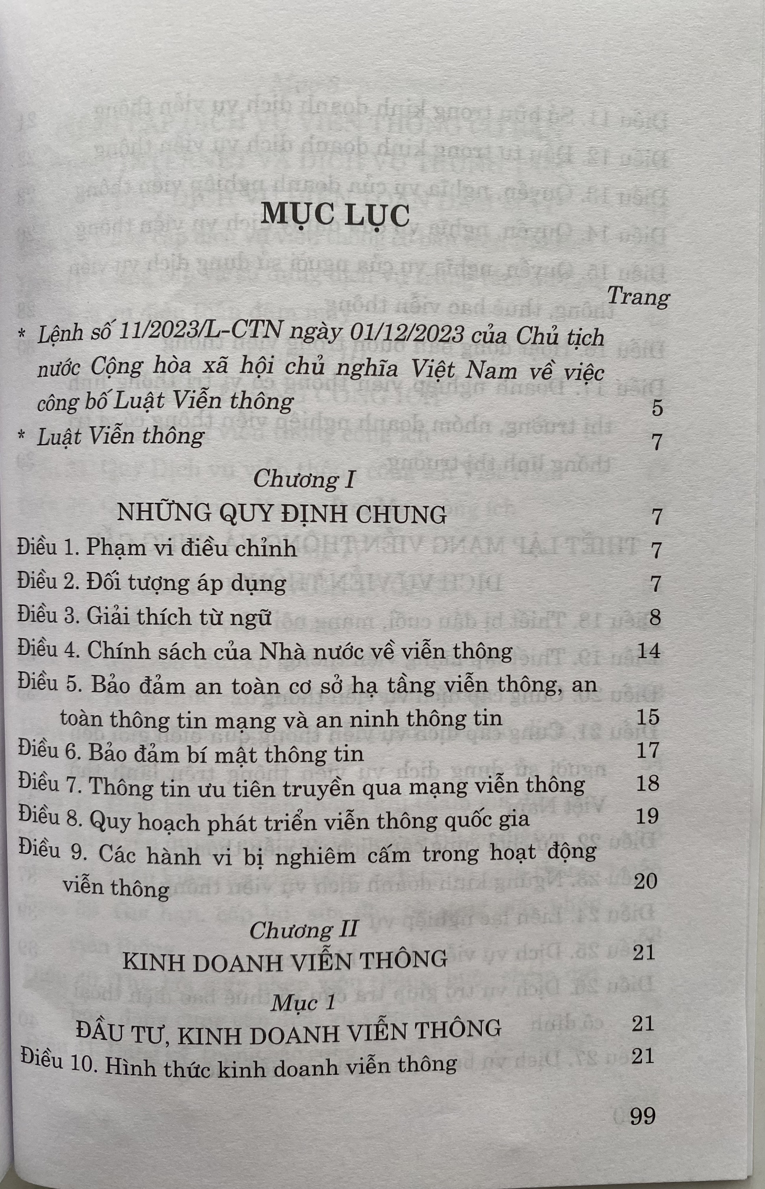 Luật Viễn Thông số 24/2023/QH15 đã được Quốc Hội khoá XV thông qua ngày 24-11-2023. Luật gồm có 10 chương, 73 điều . Luật có hiệu lực áp dụng từ ngày 01-07-2024