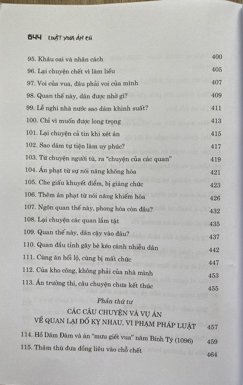 Mua tại TiktokTrong cuốn sách, tác giả đã công phu tập hợp 136 câu chuyện pháp luật thời phong kiến, được ghi lại trong các bộ chính sử của nước nhà; phân tích kỹ các tình tiết của các câu chuyện pháp luật, trong đó nhiều câu chuyện là những vụ án nổi tiếng trong lịch sử phong kiến Việt Nam, với sự có mặt của đủ các giai tầng xã hội từ vua chúa, đội ngũ quan lại các cấp, đến những người dân bình thường; liên quan tới rất nhiều mặt của đời sống xã hội.