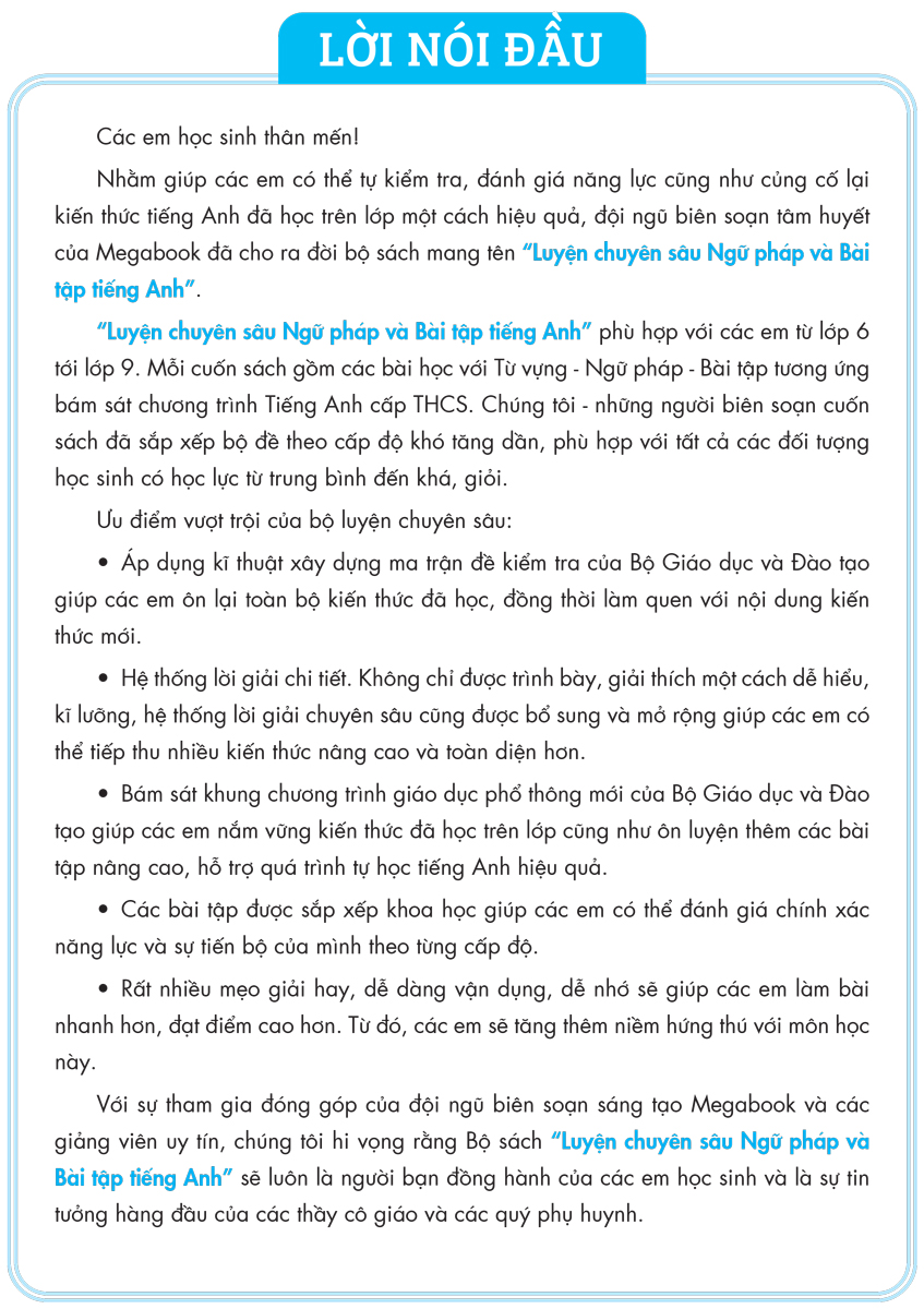 Mua tại TiktokLuyện Chuyên Sâu Ngữ Pháp Và Bài Tập Tiếng Anh 6 - Tập 1 (Theo Chương Trình Global Success) “Luyện chuyên sâu Ngữ pháp và Bài tập tiếng Anh” phù hợp với các em từ lớp 6 tới lớp 9. Mỗi cuốn sách gồm các bài học với Từ vựng - Ngữ pháp - Bài tập tương ứng bám sát chương trình Tiếng Anh cấp THCS. Chúng tôi - những người biên soạn cuốn sách đã sắp xếp bộ đề theo cấp độ khó tăng dần, phù hợp với tất cả các đối tượng học sinh có học lực từ trung bình đến khá, giỏi. ƯU ĐIỂM NỔI BẬT CỦA CUỐN SÁCH