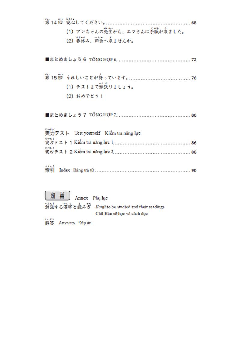 Cuốn sách gồm 15 bài (mỗi bài chia làm 2 phần), 7 bài “Tổng hợp” và 2 bài kiểm tra năng lực. Mỗi bài các bạn sẽ học trong 3-4 ngày, phần Tổng hợp” học trong 2 ngày, như vậy trong khoảng thời gian 3-4 tháng các bạn có thể hoàn thiện được chương trình N4.