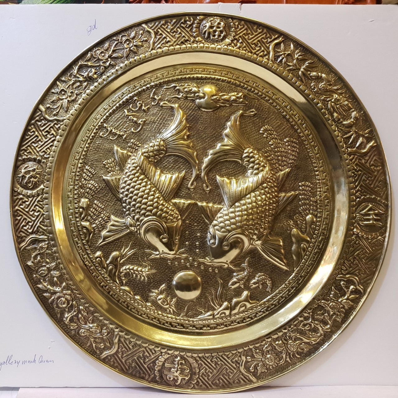Mâm đồng vàng liền tấm thúc gò nổi – LÝ NGƯ VỌNG NGUYỆT ( CẶP CÁ CHÉP) Đồng vàng nguyên chất liền tấm dày 6 rem được thúc gò chạm khảm hoàn toàn thủ công cực tinh xảo.