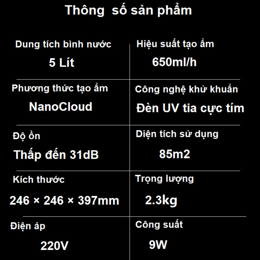 - Máy phun sương 360 độ khuếch tán đều không khí ẩm khắp phòng. Hơi nước NanoCloud siêu mịn mang nhiều độ ẩm hơn và ngăn quá trình bão hòa, đặc biệt là để tạo độ ẩm hiệu quả trong không gian rộng Không có sương trắng hoặc tích tụ nước