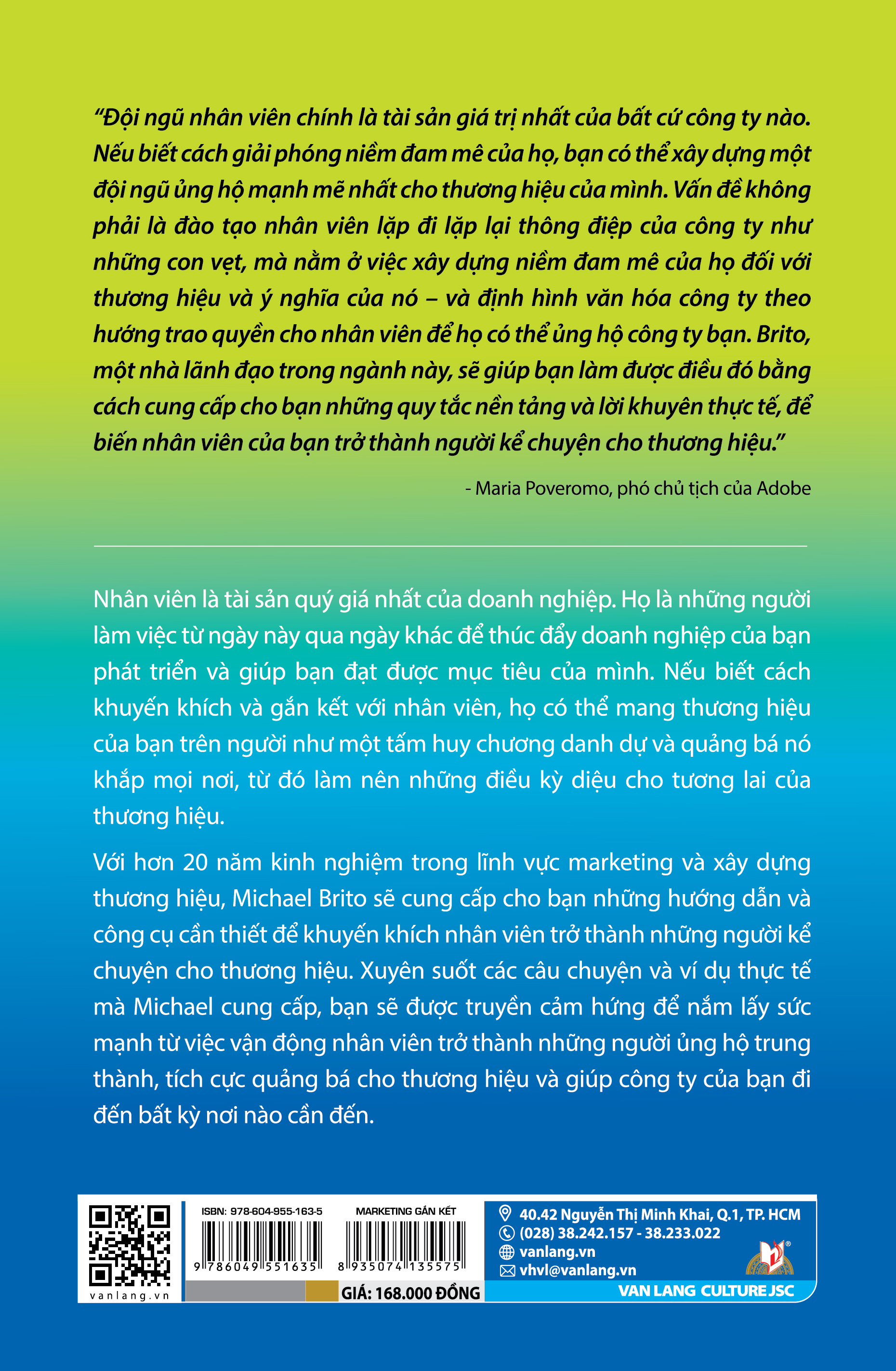 Với hơn 20 năm kinh nghiệm trong lĩnh vực marketing và xây dựng thương hiệu, Michael Brito sẽ cung cấp cho bạn những hướng dẫn và công cụ cần thiết để khuyến khích nhân viên trở thành những người kể chuyện cho thương hiệu. Xuyên suốt các câu chuyện và ví dụ thực tế mà Michael cung cấp, bạn sẽ được truyền cảm hứng để nắm lấy sức mạnh từ việc vận động nhân viên trở thành những người ủng hộ trung thành, tích cực quảng bá cho thương hiệu và giúp công ty của bạn đi đến bất kỳ nơi nào cần đến.
