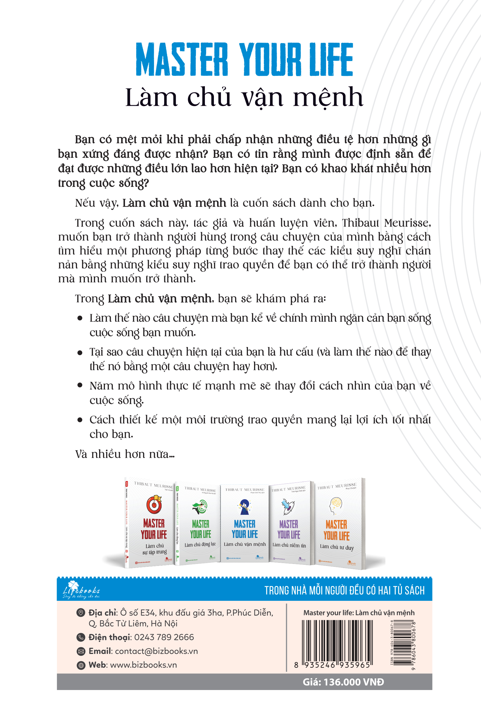 Mua tại TiktokRất nhiều nhân tố ảnh hưởng tới cuộc đời chúng ta, ví dụ như sự kì vọng của cha mẹ, của thầy cô, thái độ ghét người thân yêu kẻ địệc sử dụng tiền tài như thế nào cũng ảnh hưởng rất lớn tới sự phát triển tiền đồ, một câu nói, một suy nghĩ cũng khiến cuộc đời có những đổi thay khác biệt. Có gì trong cuốn sách Master your life - Làm chủ vận mệnh Cuốn sách do công ty sách Bizbooks xuất bản và phát hành sẽ giúp bạn khám phá được chính xác câu chuyện hiện tại của mình là gì và nó gây cản trở đến việc bạn muốn được sống cuộc đời như mình mong muốn như thế nào. Quan trọng hơn, bạn sẽ tìm hiểu cách thay thế nó bằng một câu chuyện tiếp thêm sức mạnh, hỗ trợ bạn tạo ra tương lai lý tưởng mà bạn hướng tới với tổng nội dung gồm 3 phần: