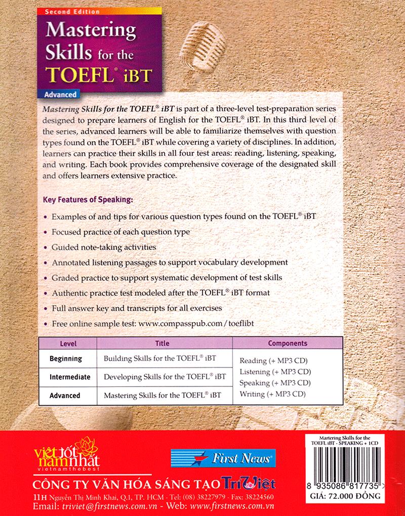Mua tại TiktokMastering skills for the Toefl iBT - Speaking giúp người học nâng cao khả năng phát âm, lựa chọn từ vựng, Paraphrasing, Note-taking, tóm tắt, sử dụng Phrasal Verb một cách hiệu quả và chuẩn nhất . Ngoài ra, bạn còn được học thêm các điểm ngữ pháp, những cụm từ hữu ích thường dùng cho môn nói. Cuốn sách bao gồm nhiều bài luyện tập bao gồm đầy đủ các kỹ năng cần thiết cho phần thi Nói. Bạn sẽ được thực thành các bài tập từ đơn giản cho đến phức tạp. Cách phát âm chuẩn, cách nói lướt cũng như tập nói cái chủ đề có sẵn trong thời gian nhất định. Ngoài ra, giáo trình còn giúp bạn kết hợp các kỹ năng còn lại hỗ trợ cho phần nói để đạt hiểu quả cao nhất trong quá trình ôn luyện.