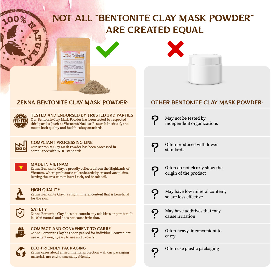 - Chất lượng sản phẩm đạt tiêu chuẩn quốc tế: Được khai thác từ vùng mỏ Bentonite Clay trầm tích, Mặt nạ bùn khoáng núi lửa ZENNA được tìm thấy chứa nhiều loại vi khoáng thiết yếu có lợi, giúp tái tạo hệ thống phòng vệ cho da, giúp da sạch, sáng và khỏe dần từ sâu bên trong. Để được lưu hành sản phẩm trên thị trường, bùn khoáng ZENNA đã trải qua các quá trình kiểm duyệt khắt khe về tiêu chuẩn chất lượng của Sở Y tế, được xử lý khai thác tại nhà máy chuẩn GMP và được đóng gói trong môi trường khép kín theo quy trình đạt chuẩn ASEAN. Bùn khoáng ZENNA được công nhận là sản phẩm đạt tiêu chuẩn về hàm lượng khoáng Bentonite kiềm, nguyên chất 100%. Trong Bentonite kiềm chứa các thành phần chủ yếu là Canxi, Magie, Natri, Silic… kèm một số khoáng chất vi lượng rất cần thiết cho cơ thể con người và không chứa thành phần độc hại nào.