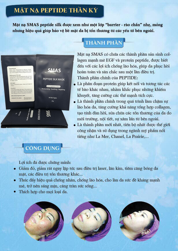 - SMAS là mặt nạ phục hồi da giúp dưỡng ẩm, làm dịu và giảm kích ứng da, đồng thời tái tạo da, giúp da phục hồi nhanh chóng sau liệu trình lăn kim, phi kim, laser, peel da,… giúp da khỏe mạnh, mịn màng.