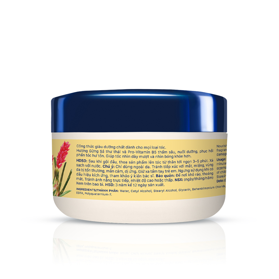 Công dụng : Công thức giàu dưỡng chất dành cho mọi loại tóc. Hương gừng sả thư thái và Pro-Vitamin B5 thấm sâu, nuôi dưỡng, phục hồi phần tóc hư tổn. Giúp tóc nhìn dày mượt và nhìn bóng khỏe hơn. Hướng dẫn sử dụng: Sau khi gội đầu, thoa sản phẩm lên tóc từ thân tới ngọn 3-5 phút. Xả sạch với nước. Thành phần: Water, Cetyl Alcohol, Stearyl Alcohol, Glycerin, Behentrimonium Chloride, Panthenol, Phenoxyethanol, Isopropyl Alcohol, Fragrance, Chlorphenesin, Disodium EDTA, Polyquaternium-7.