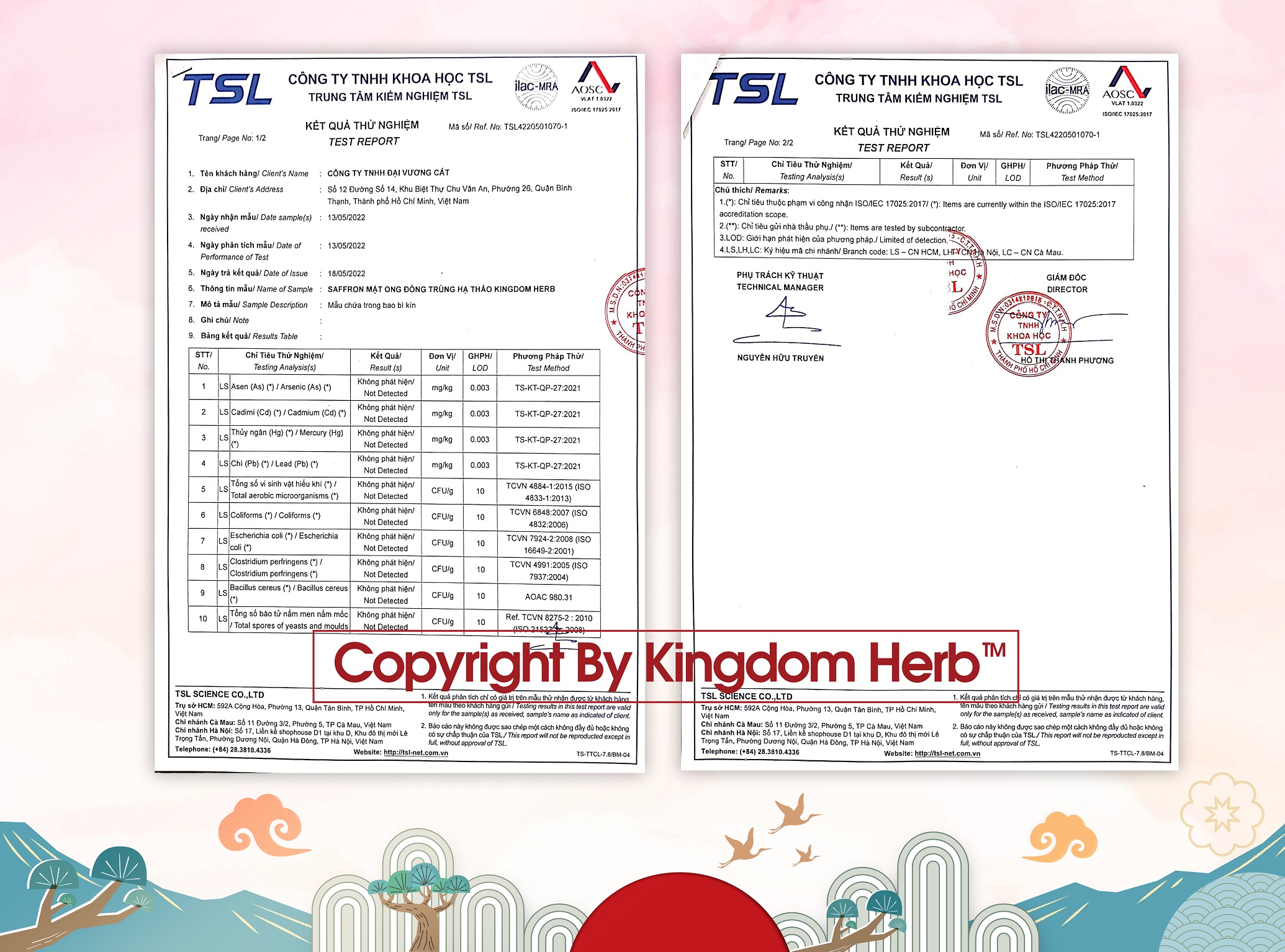 - Đông trùng hạ thảo Kingdom Herb được chứng nhận vệ sinh an toàn thực phẩm và chứng nhận chất lượng tại trung tâm kiểm nghiệm TSL