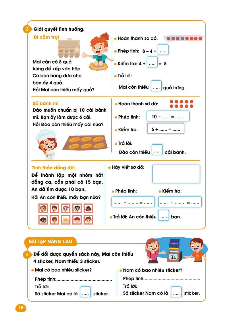 Một số bài toán có thể thấy khá khó với các bé ở độ tuổi này. Nhưng với phương pháp khoa học, cấp độ tăng dần từ dễ đến khó, bé sẽ nhận thức và thực hiện một cách dễ dàng. Các dạng toán được minh họa và hướng dẫn thông qua màu sắc, đồ chơi hay hoạt động hàng ngày giúp bé tự hiểu được trình tự tư duy, tìm ra đáp án, xây dựng vốn kiến thức Toán học.