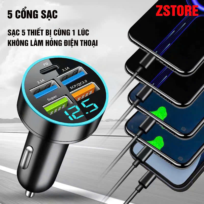 TẨU SẠC NHANH 5 CỔNG 150W CHO Ô TÔ NGUỒN 12V và 24v