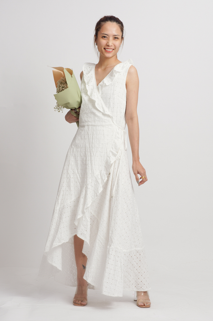 Maxi Cotton Cao Cấp Luna Llena, nền vải Lazer Cut độc đáo, tạo lỗ như ren, sang trọng, chất cotton dày dặn, thân trước đắp chéo, có thể tăng giảm eo. Phom rộng. Có lớp