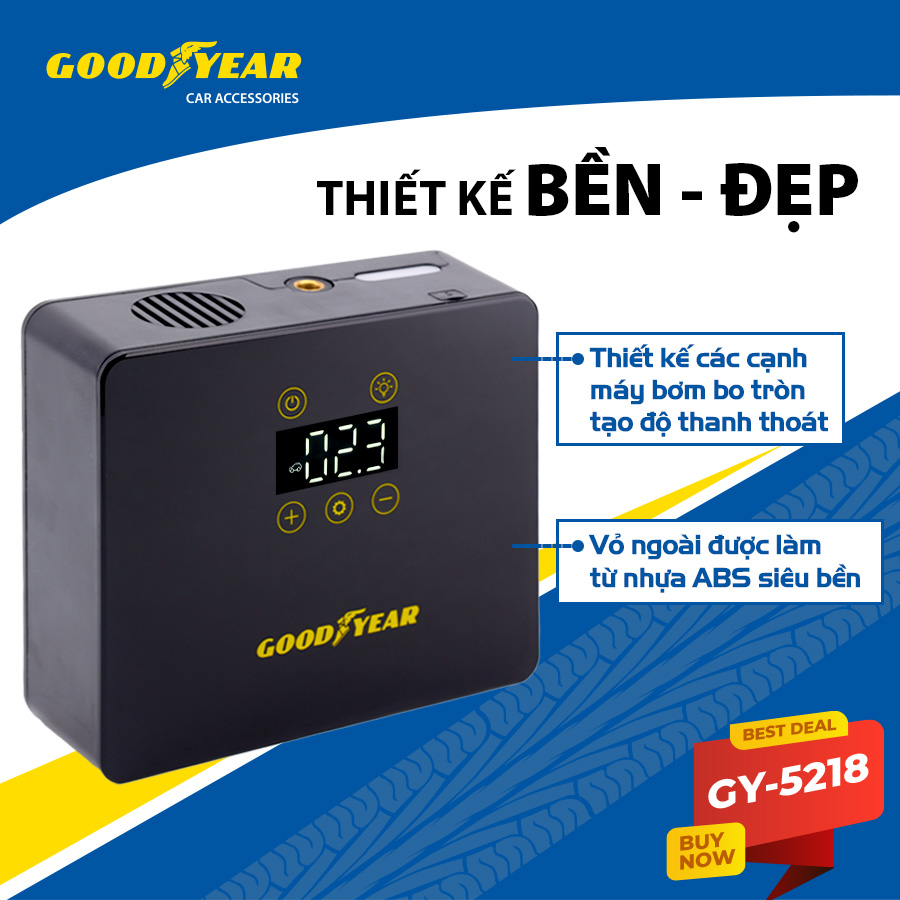 SHOP CIND XIN CHÀO QUÝ KHÁCH, CẢM ƠN QUÝ KHÁCH ĐÃ QUAN TÂM SẢN PHẨM CỦA SHOP CIND MÔ TẢ SẢN PHẨM Máy Bơm Lốp Xe GOODYEAR GY-5218 Cảm Ứng Đa Điểm Tự Ngắt Thông Minh Đặc điểm nổi bật: Máy bơm hơi chính hãng thương hiệu nổi tiếng Goodyear Màn hình hiển thị cảm ứng đa điểm, phím cảm ứng cực nhạy, giúp người dùng dễ dàng thao tác Mặt trên của bơm phủ bằng lớp kính cường lực, chắc chắn, không bám bụi, dễ vệ sinh Kích thước nhỏ gọn nhẹ, có thể dễ dàng cất gọn trong cốp xe hay dưới gầm ghế xe, được trang bị túi vải đựng chuyên dụng Dây dẫn khí được bọc Kevlar chịu được áp lực lớn, có chiều dài 62cm giúp người dùng dễ dàng thao tác ở những vị trí xa Tốc độ bơm cực nhanh, tự ngắt khi bơm đủ áp suất của lốp xe Với bốn chế độ cài đặt áp suất có thể lập trình trước, sẵn sàng bơm hơi lốp xe đạp, xe máy và ô tô cũng như một quả bóng thể thao hay phao hơi... Tích hợp đèn LED thuận tiện sử dụng trong không gian tối Sản phẩm có 2 đầu bơm khác nhau Thông số kỹ thuật: