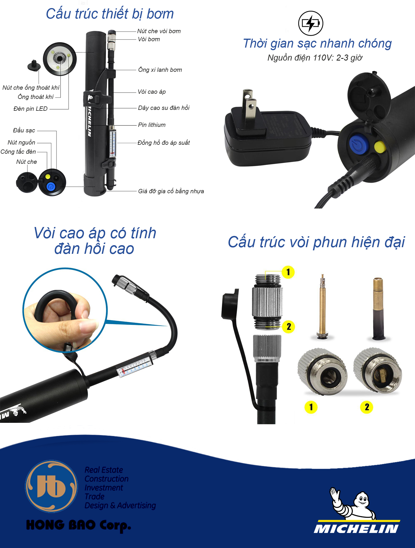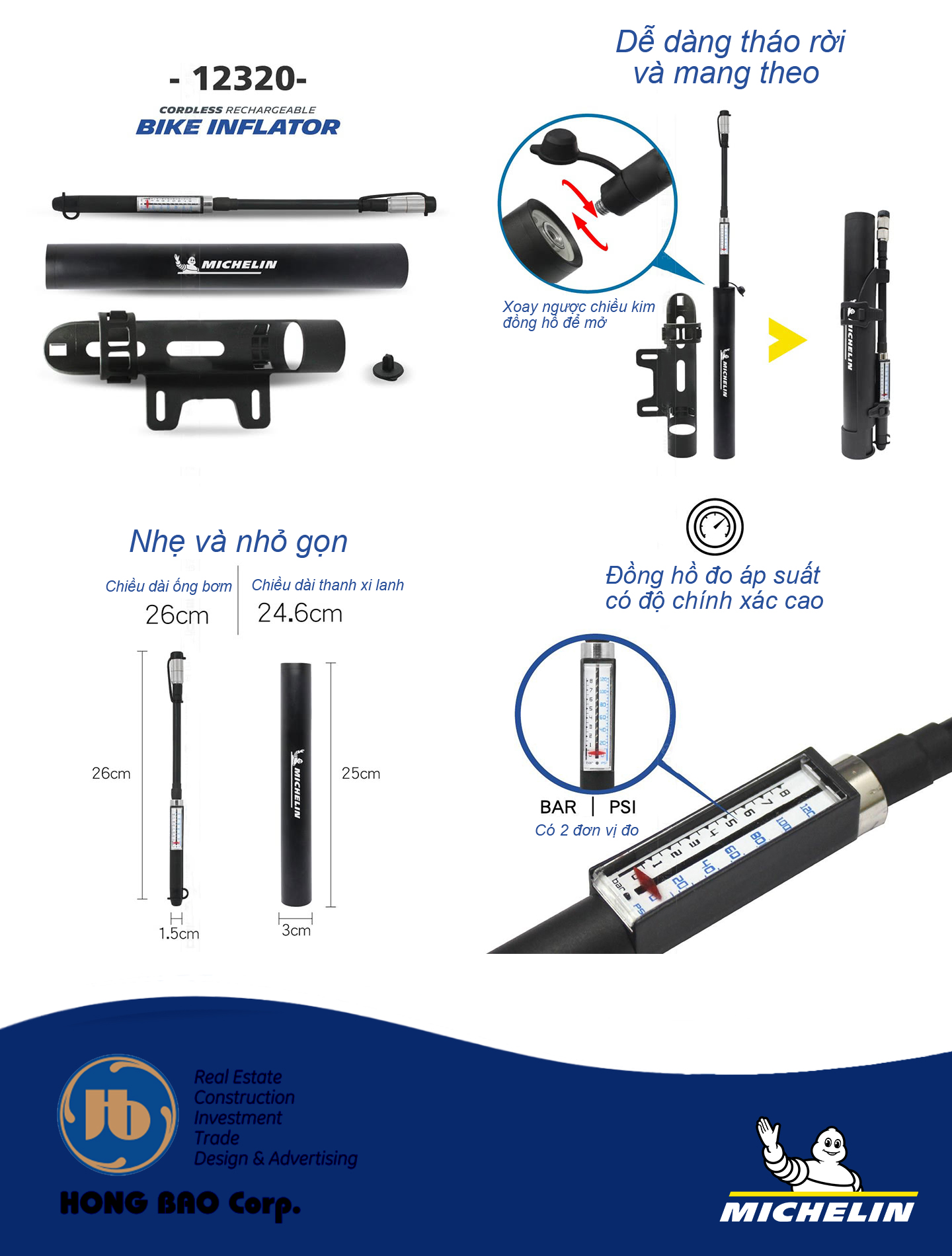 THÔNG TIN KỸ THUẬT - Tên sản phẩm: Máy bơm lốp xe đạp, xe máy, mô tô siêu tốc MICHELIN 12320 dùng pin - Model: 12320 - Công dụng: bơm hơi các loại xe đạp, xe