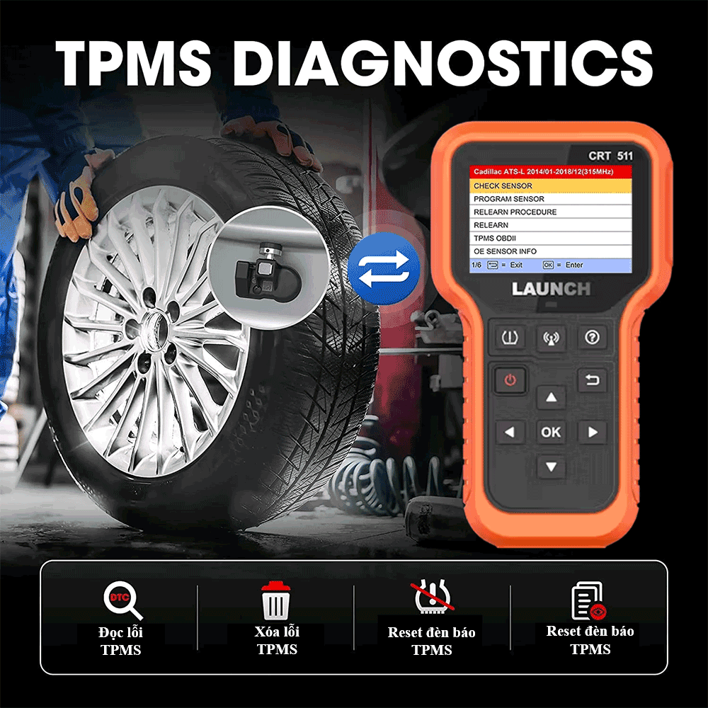 Thiết bị cài đặt áp suất lốp LAUNCH CRT511 là thiết bị chuyên dụng xử lí lỗi liên quan đến áp suất lốp. CRT511 với thiết kế cứng cáp và tính năng tốt nhất trên thị trường hiện nay, cho phép chúng ta cài đặt thay mới những cảm biến chính hãng, xem dữ liệu của lốp: áp suất, pin và nhiệt độ. Có thể tự hiệu chính cả sóng 433/315MHz=